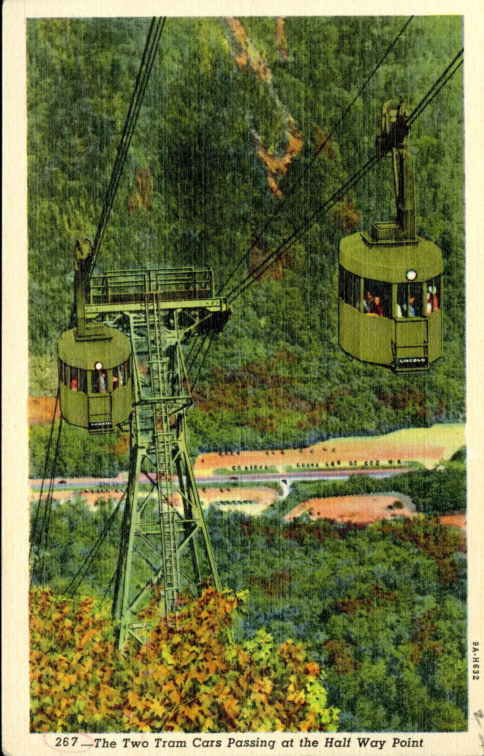 Picture of two tram cars passing each other on Cannon Mountain during fall. Trees and a road are seen in the background. Printed on the back reads, "There is a moment of excitement as those returning from the Mountain Station greet the eager visitors making the ascent. A Tramway ride is the vacations' biggest thrill for young and old alike."Collection