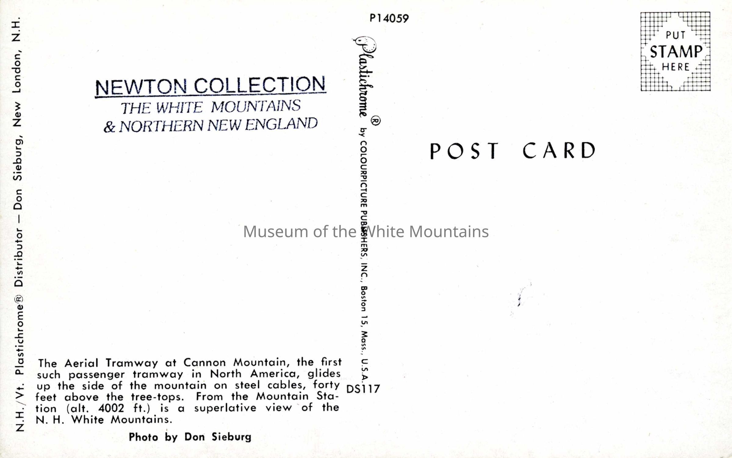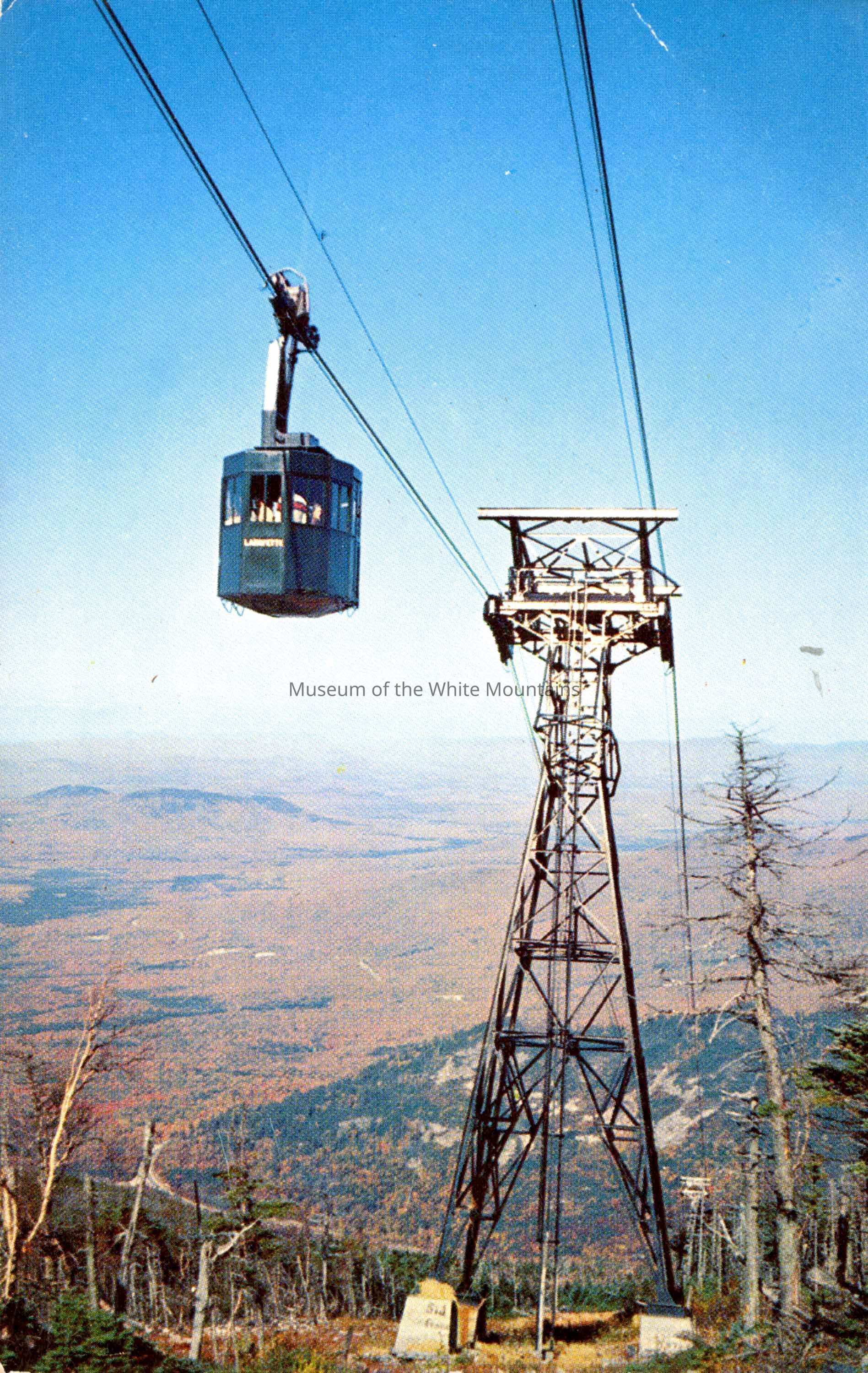 Color photo of the Cannon Mountain Aerial Tramway with a car carrying passengers past a tower during the fall. The White Mountains appear in the background. A description on the back reads, "The Aerial Tramway at Cannon Mountain, the first such passenger tramway in North America, glides up the side of the mountain on steel cables, forty feet above the tree-tops. From the Mountain Station (alt. 4002 ft.) is a superlative view of the N.H. White Mountains."Collection