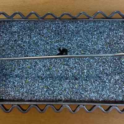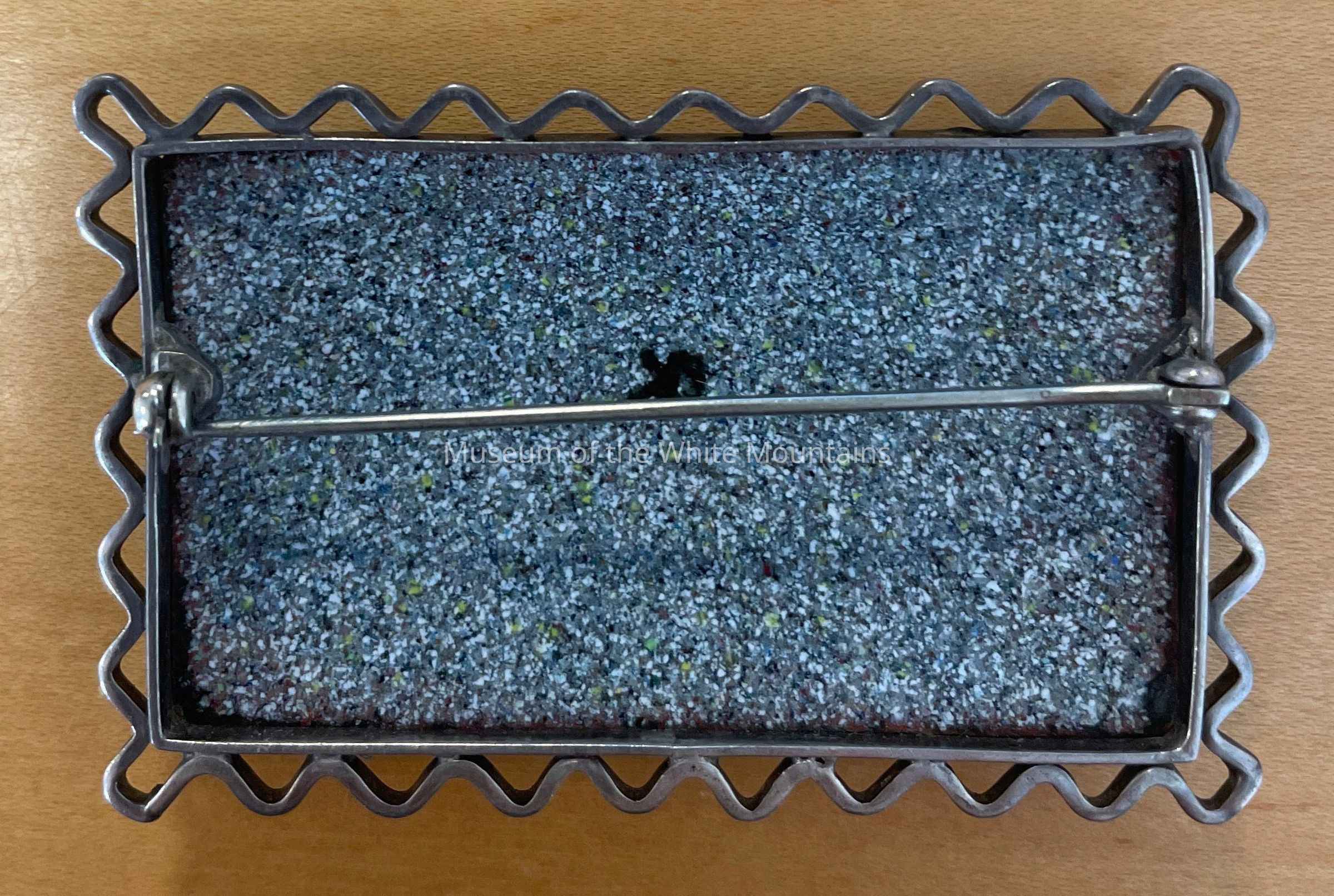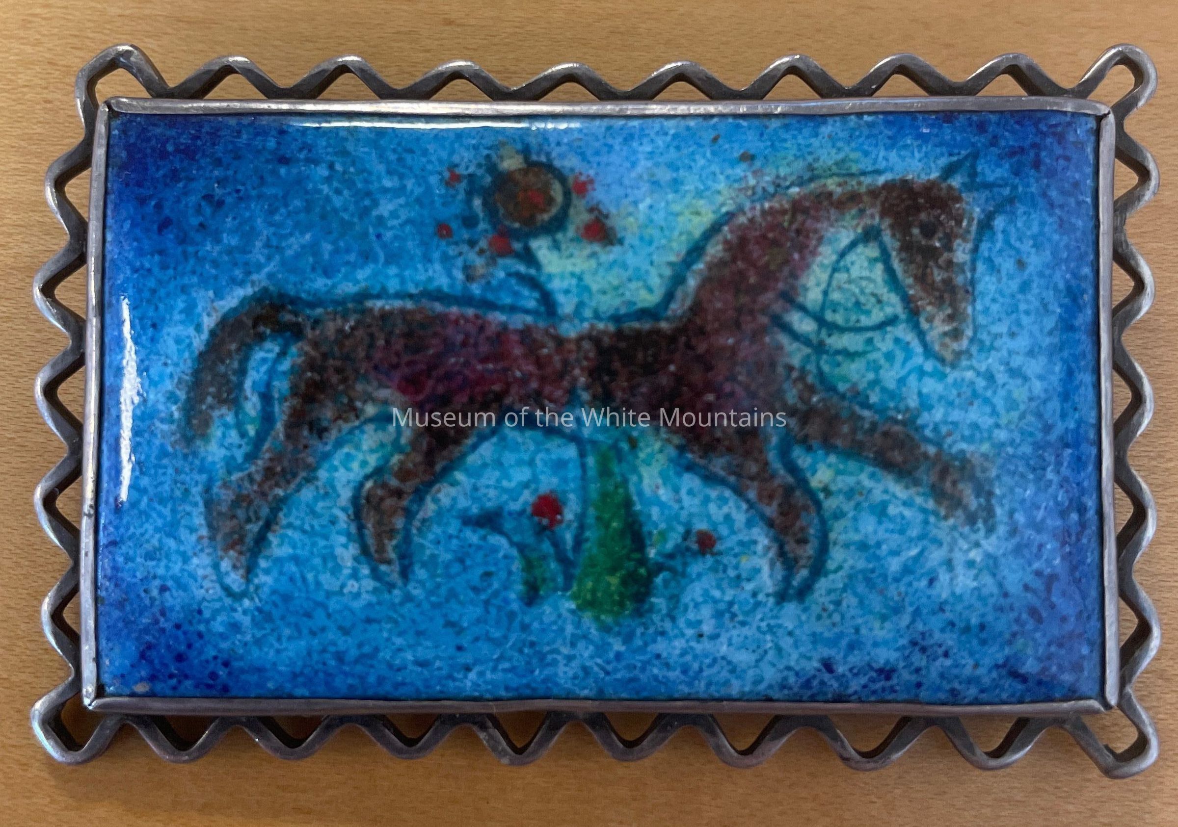 Enamel pin depicting a horse and flower against a blue background.Acquisition