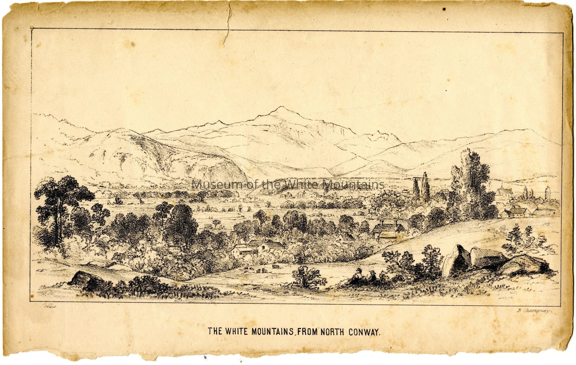 A landscape lithograph of the White Mountains viewed from North Conway.