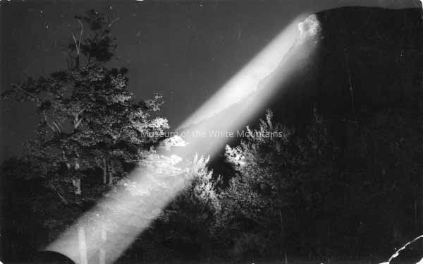 Black and white nightime view of the Old Man of the Mountain with a spotlight shining on his face. Photography by Dick Smith.