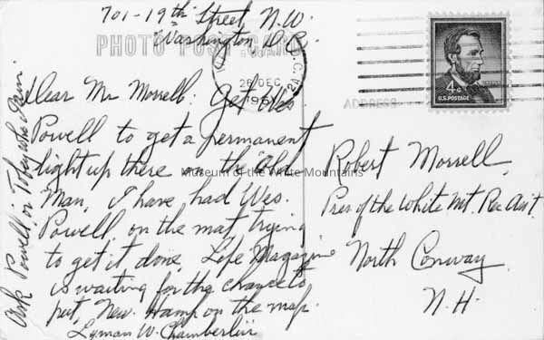 Transcription: "Dear Mr Morrell: Get Wes Powell to get a permanent light up there on the Old Man. I have had Wes Powell on the mat trying to get it done. Life Magazine is waiting for the chance to put New Hamp. on the map.