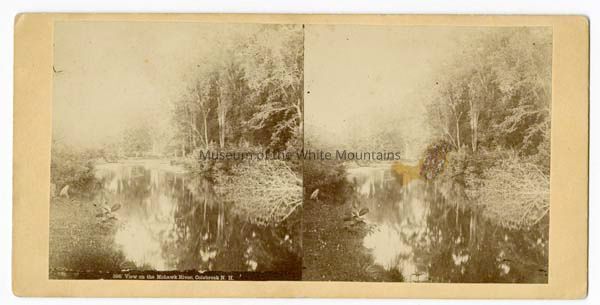 View of Mohawk River in Colebrook, N.H. The river is in the center of the photo with trees flanking both sides.