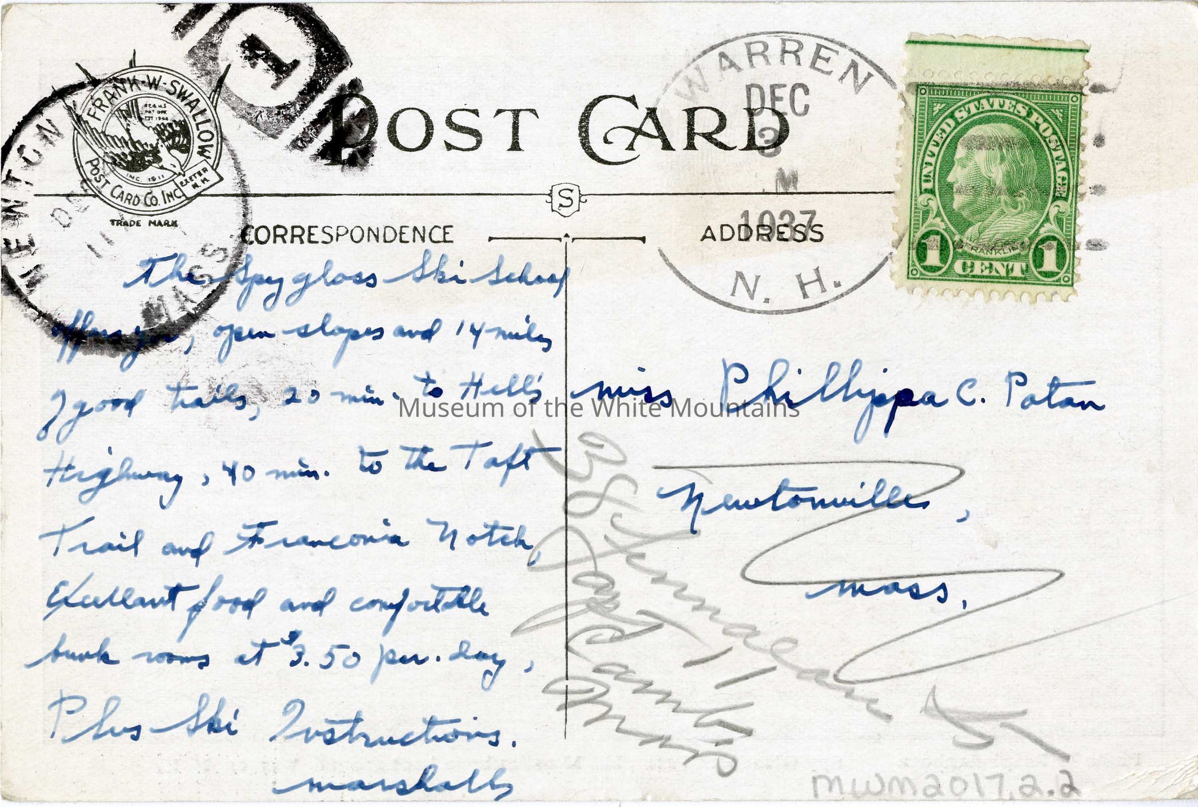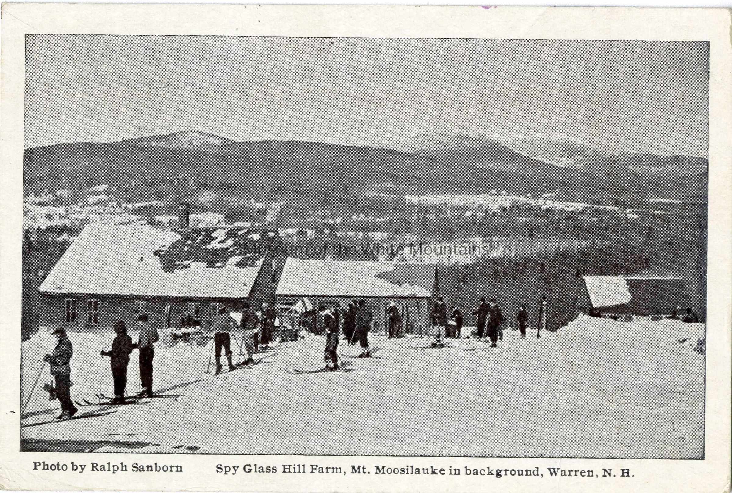 Transcription: "The Spy glass ski school offers you, open slopes and 14 miles of gorgeous trails, 20 minutes to Hill's Highway. 40 minutes to Taft Trail and Franconia Notch, excellent food and confortable bunk rooms at $3.50 per day,plus ski instructions, Marshalls."