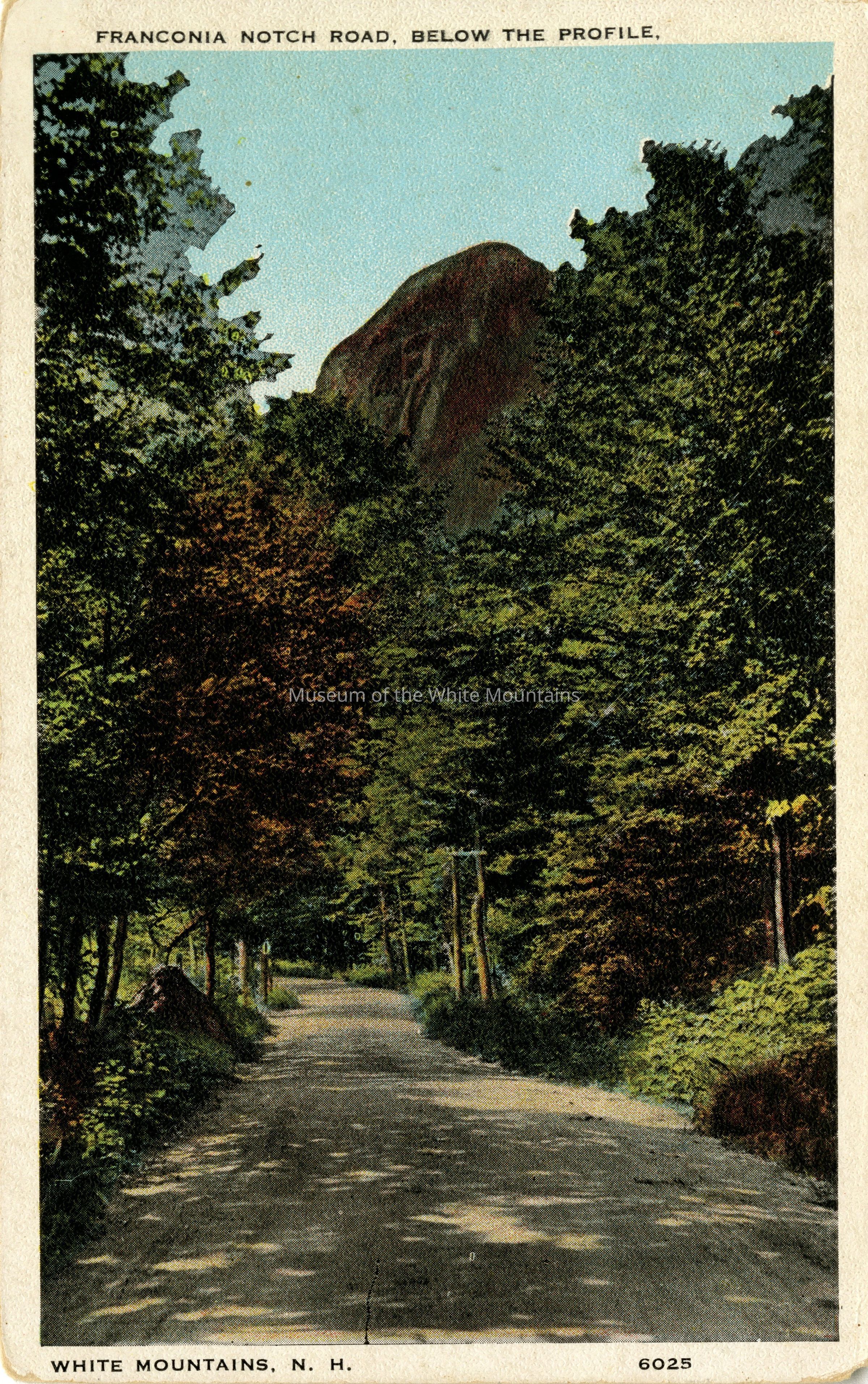 A portrait postcard featuring a colored photograph of Franconia Notch Road below the profile.