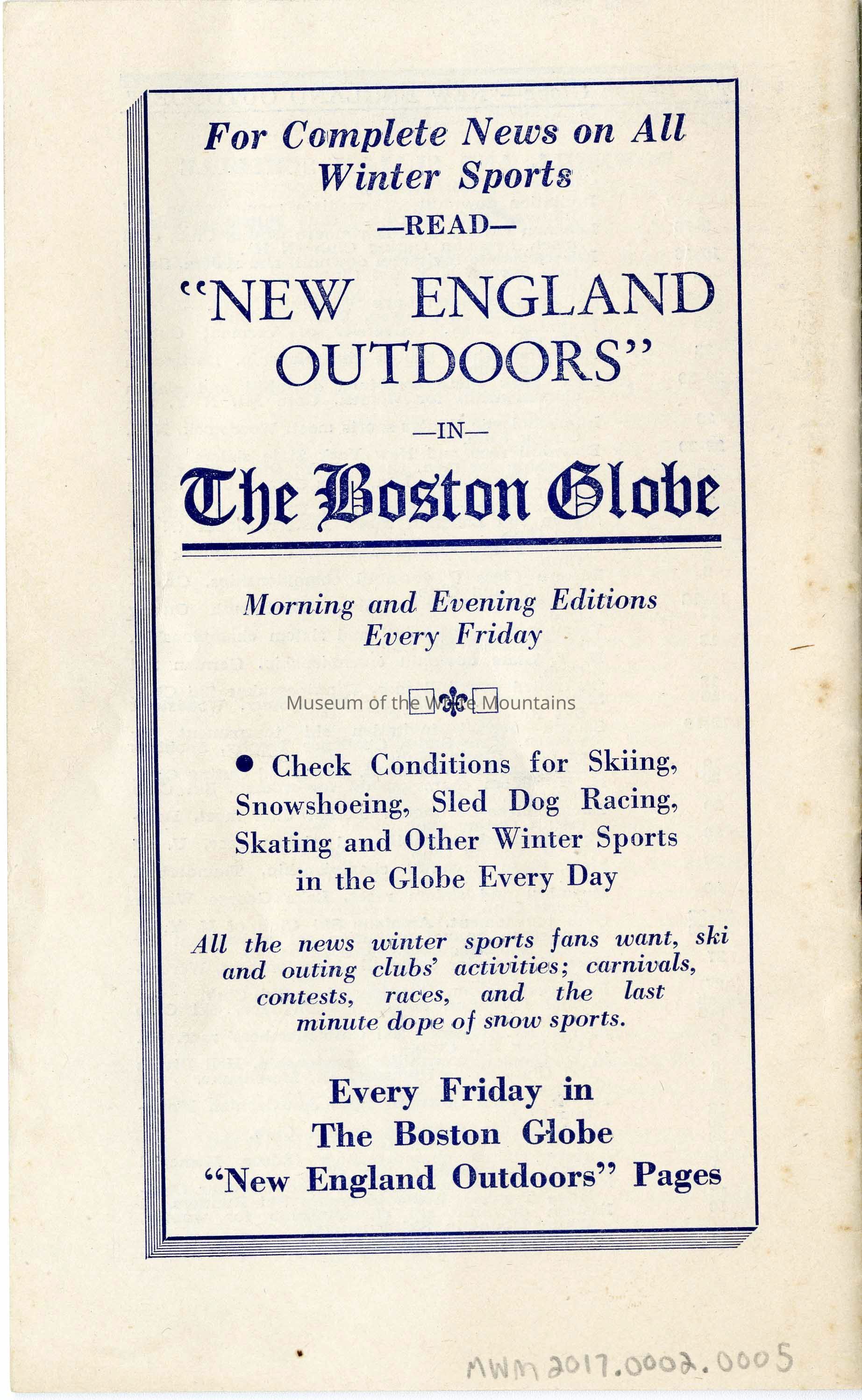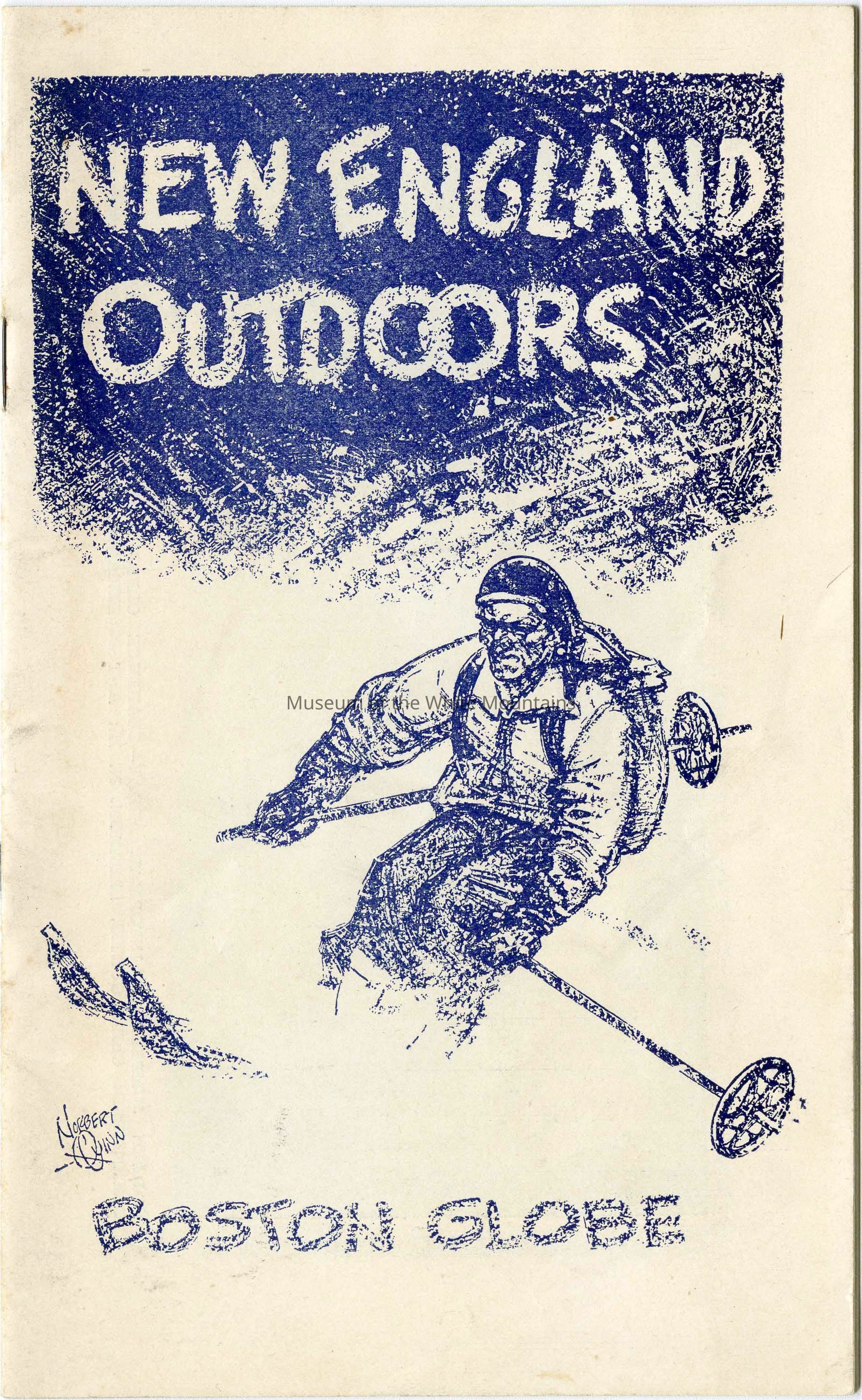 The document is a small booklet entitled "New England Outdoors", published by the Boston Globe. The booklet contains a multitude of ski trails, jumps, locations for sledding and other winter activities.Collection