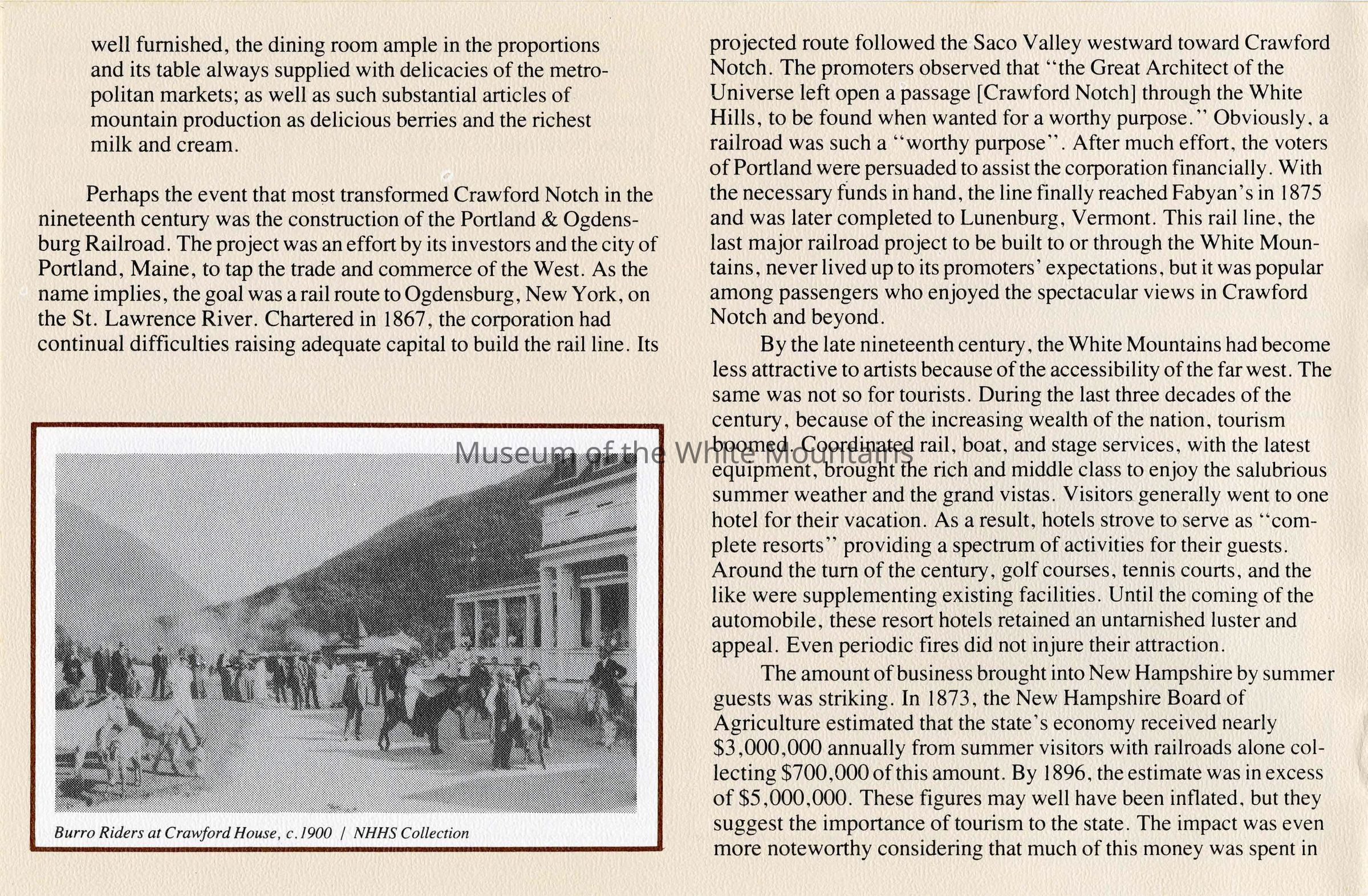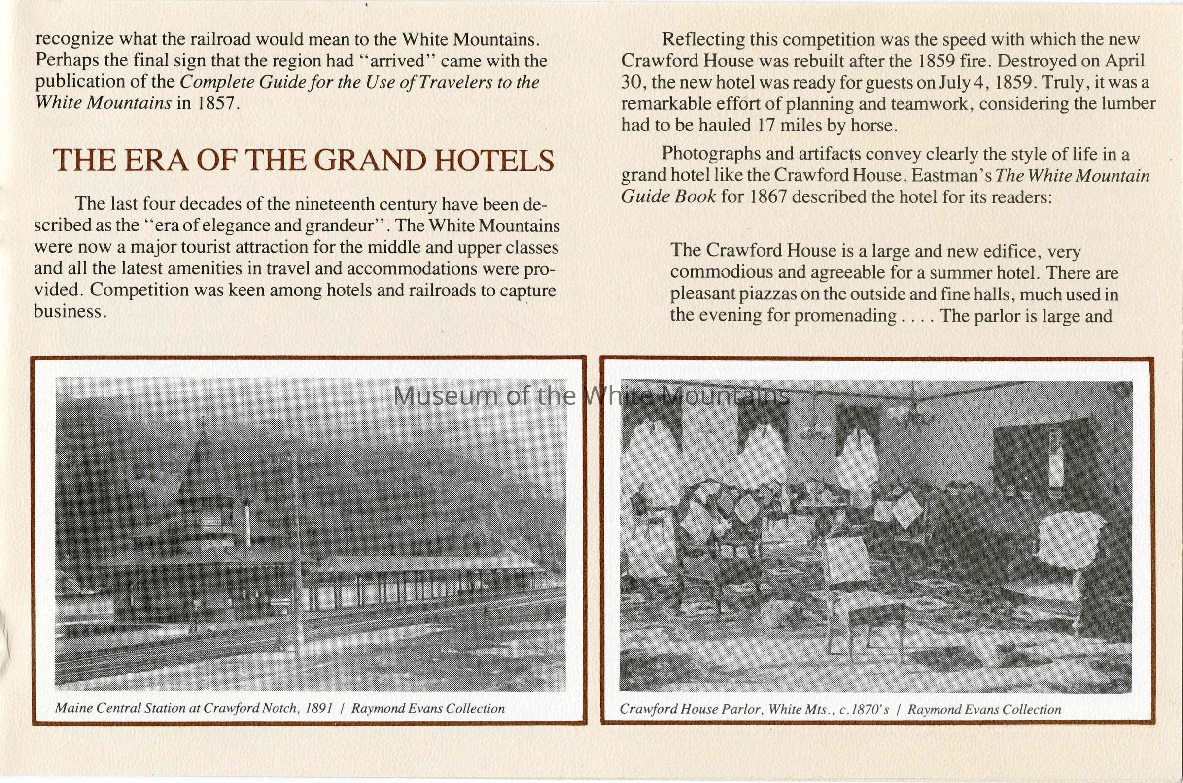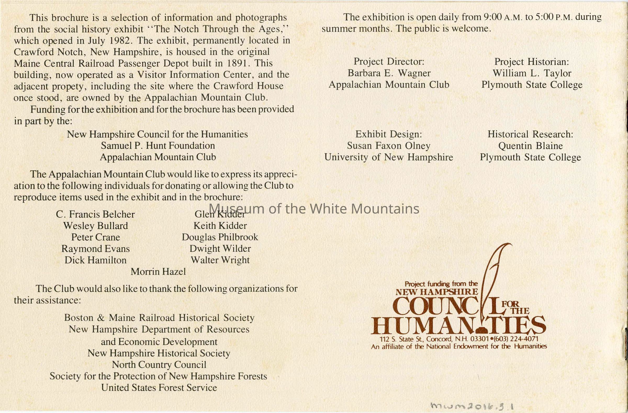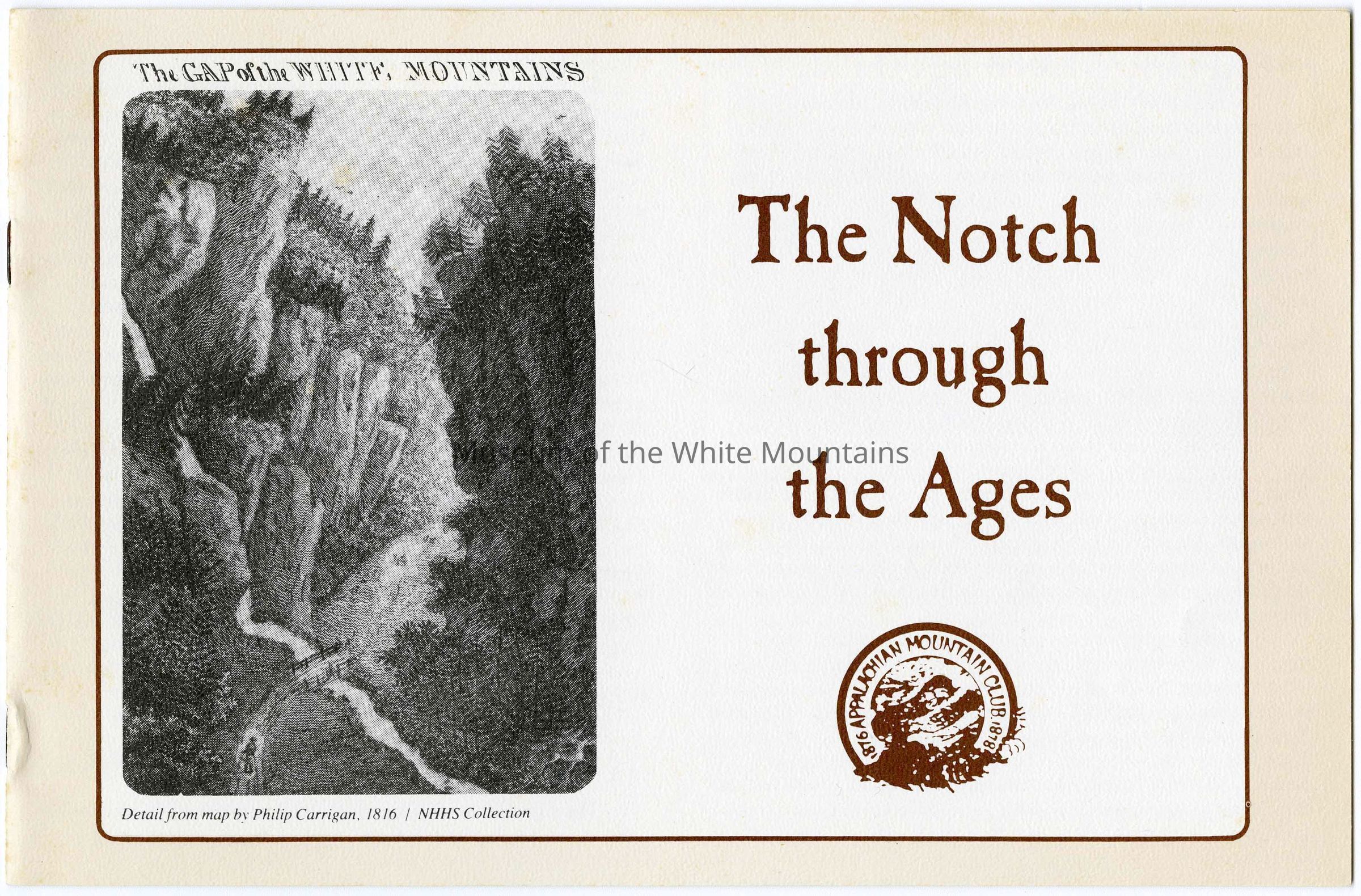 This brochure is a selection of information and photographs from the social history exhibit "The Notch Through the Ages", which opened in July 1982. The exhibit, permanently located in Crawford Notch, New Hampshire, is housed in the original Maine Central Railroad Passenger Depot built in 1891.Collection