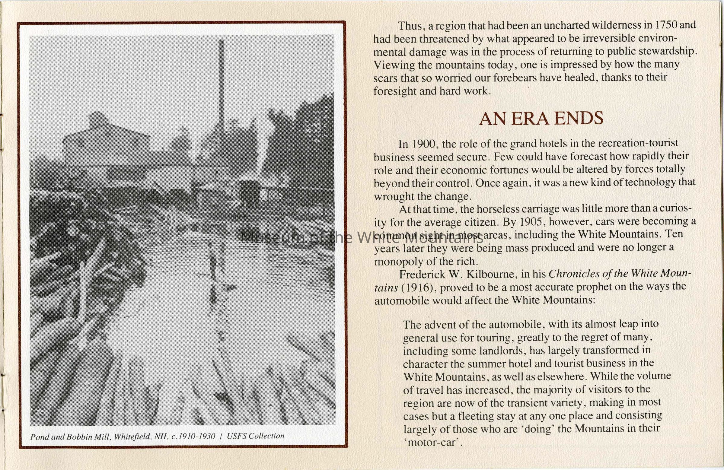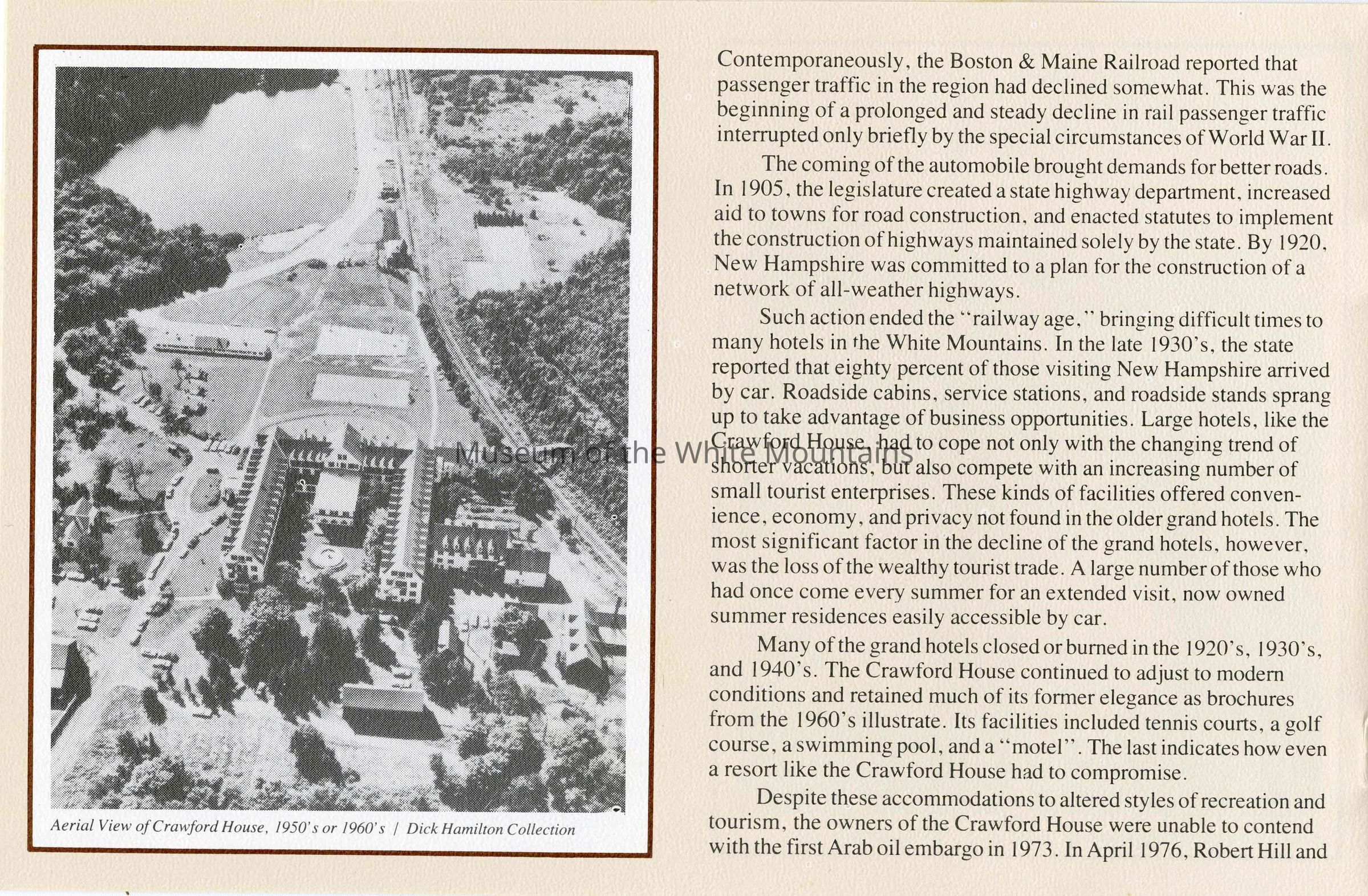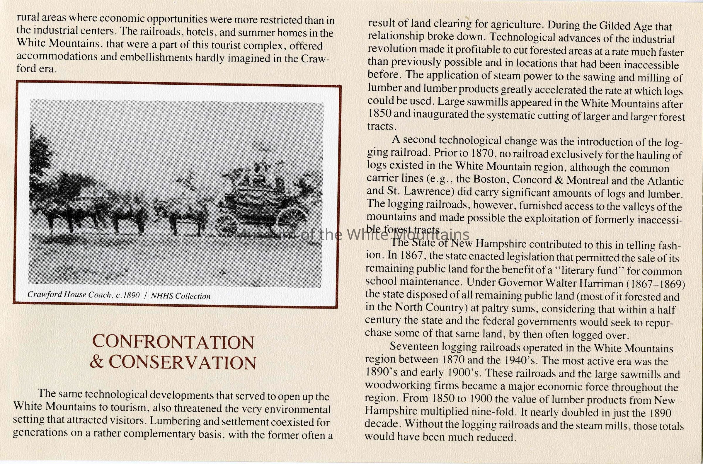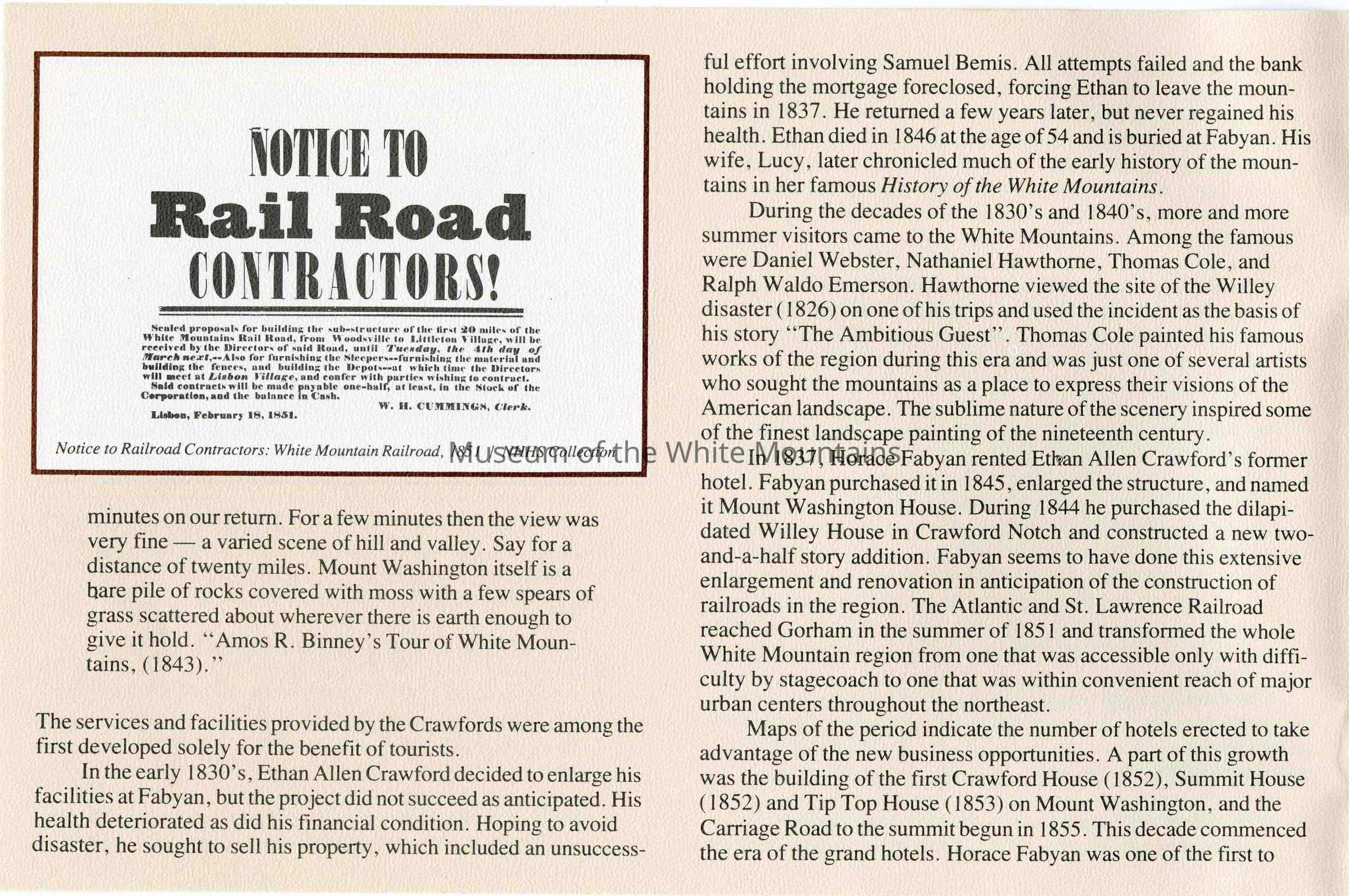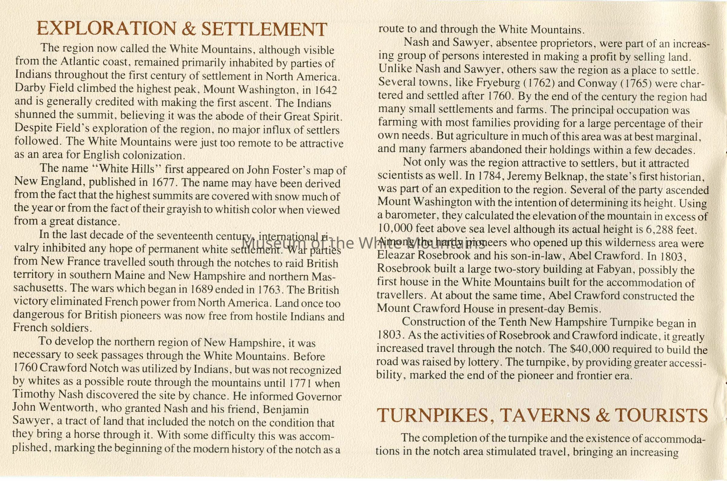 This brochure is a selection of information and photographs from the social history exhibit "The Notch Through the Ages", which opened in July 1982. The exhibit, permanently located in Crawford Notch, New Hampshire, is housed in the original Maine Central Railroad Passenger Depot built in 1891.Collection