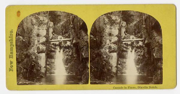 View of cascade in the flume is central with trees and rocks in Dixville Notch.