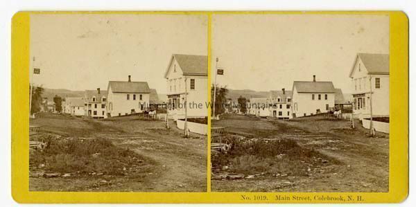 View of Main Street, Colebrook, N.H. Includes buildings shrubs and the dirt street. There is also a horse and carraige in the photo.