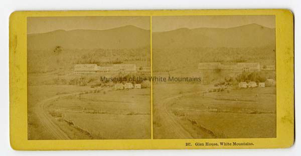 View of Glen House in Gorham, N.H. Includes buildings, shrubs, trees, fences, and the road approaching the hotel.