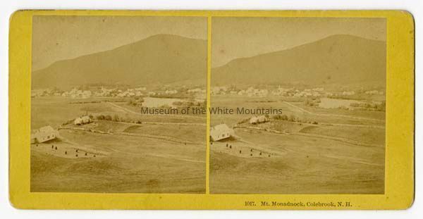 View of Colebrook, N.H. with roads, trees, shrubs fields, and buildings in the foreground. In the background is Mount Monadnock, Vermont. Written on the back in pencil is possibly, [Not Legible] "Jennine A. Lillian."Acquisition