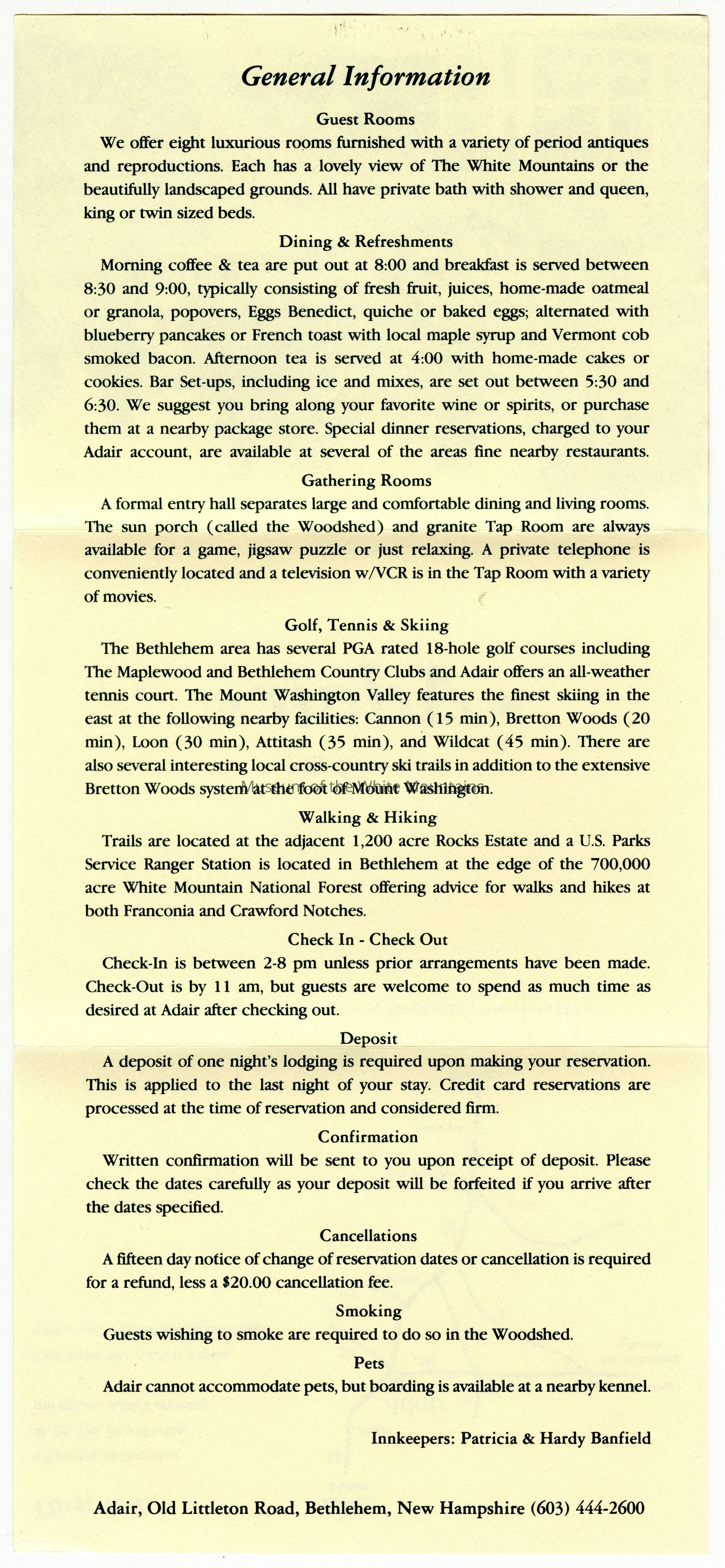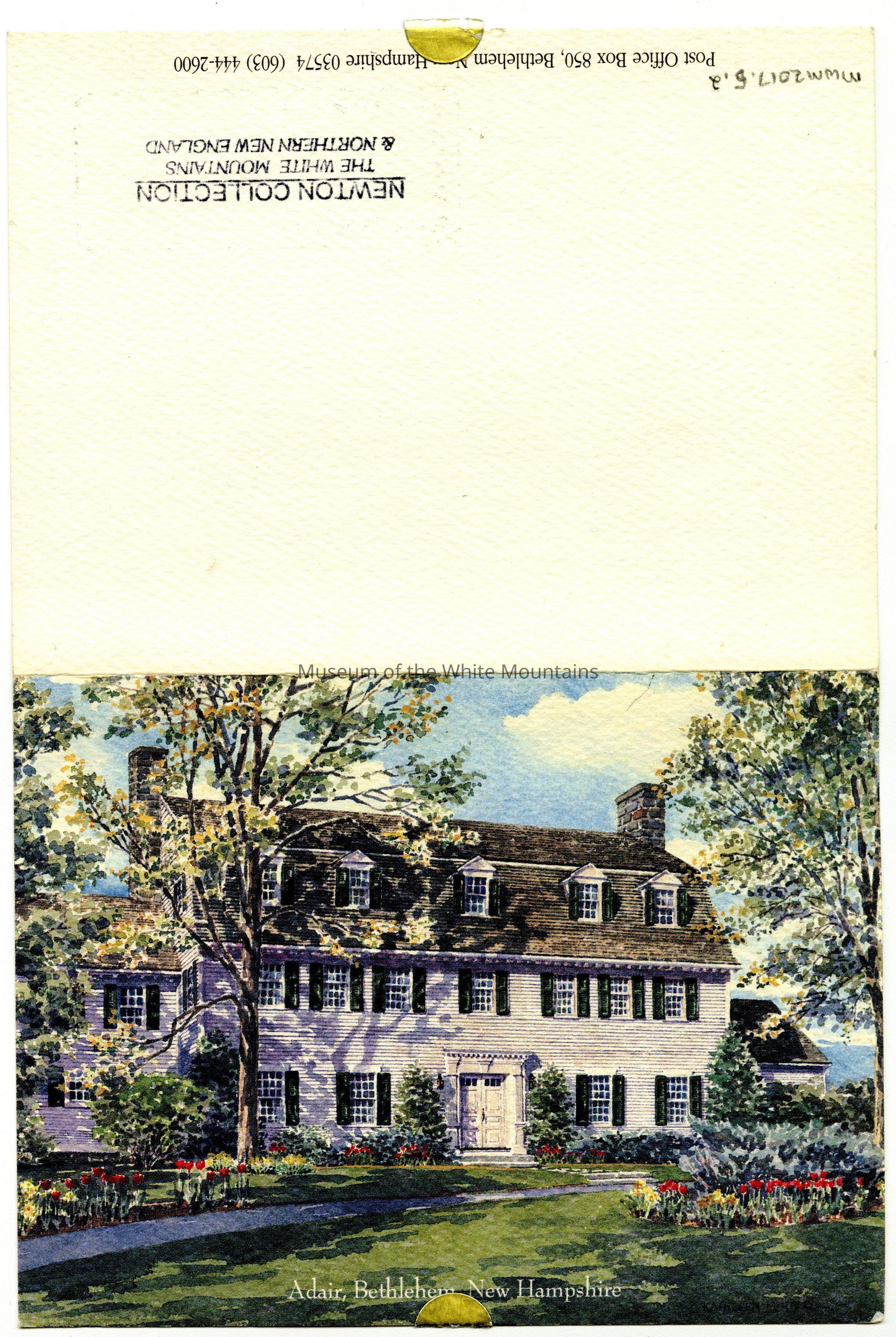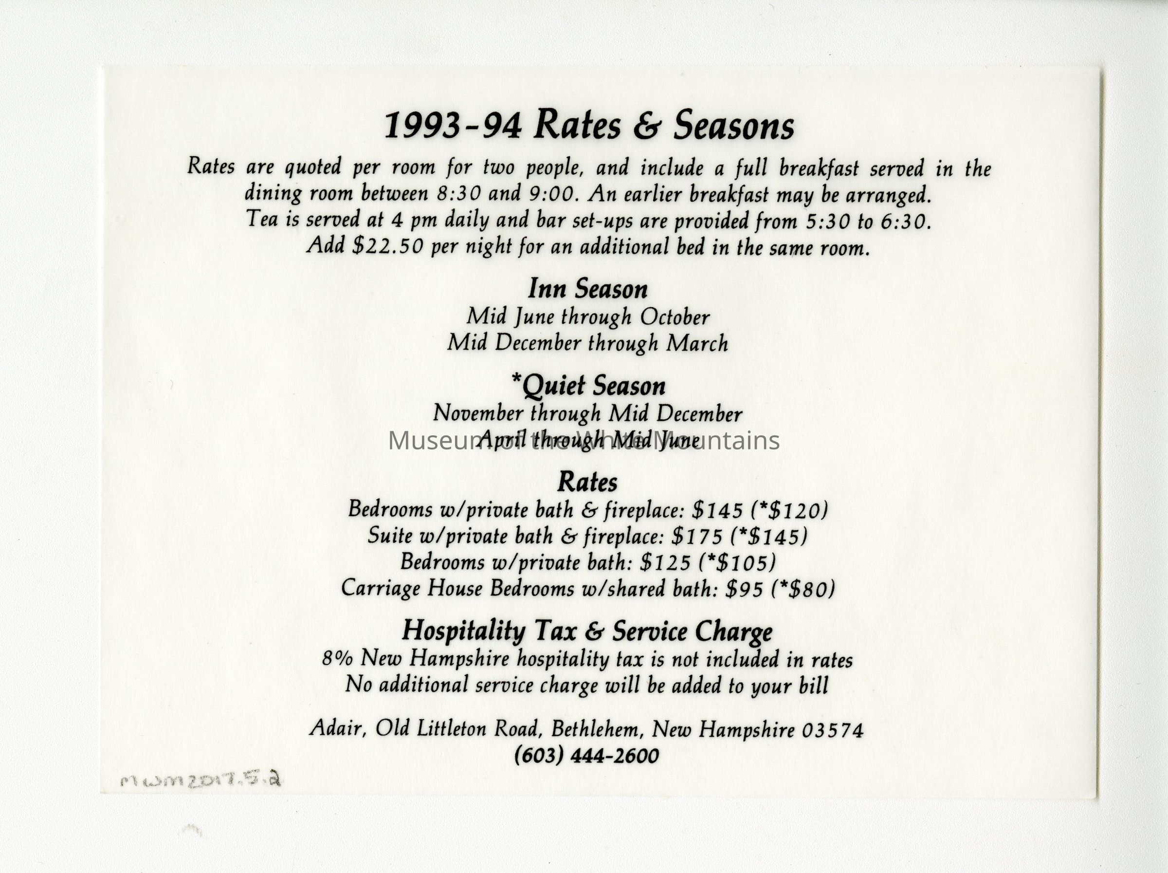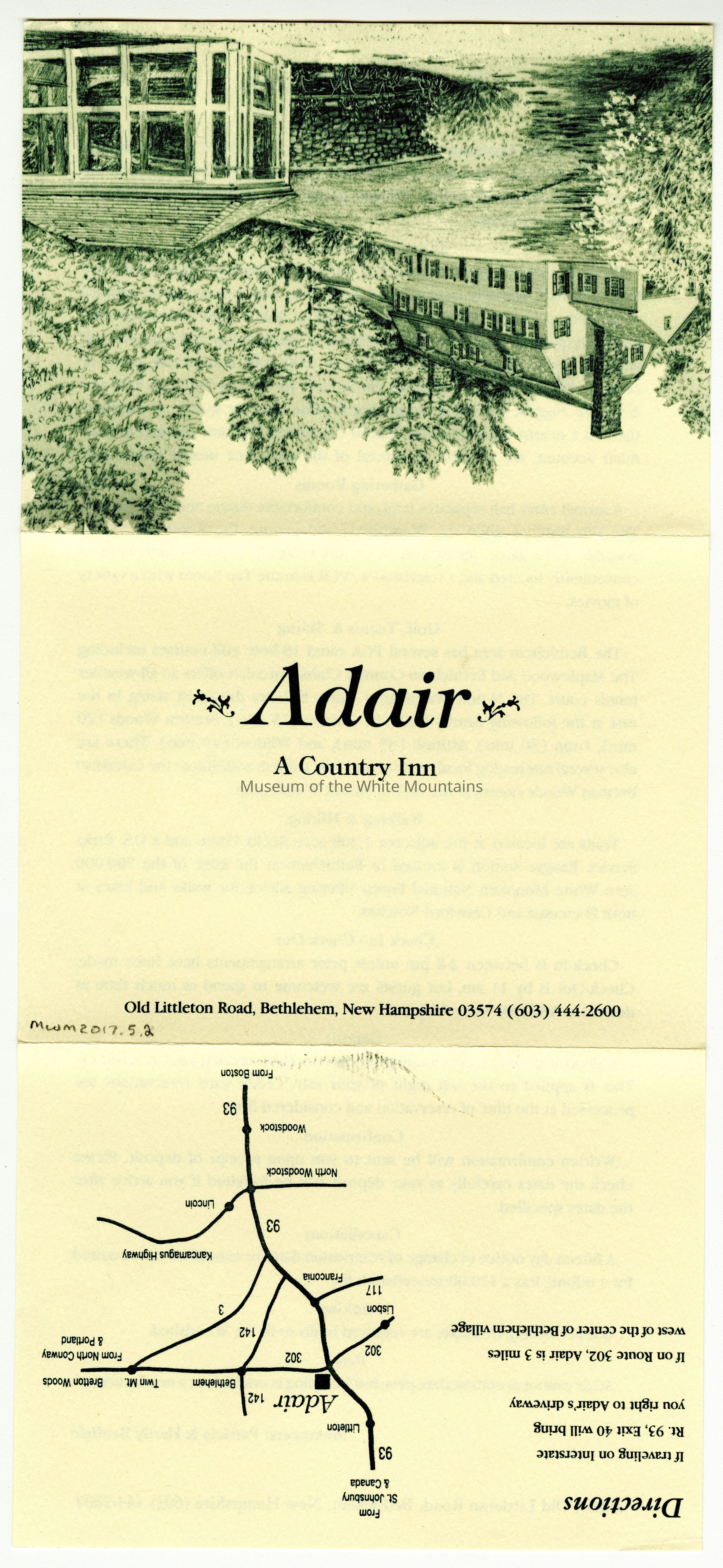 Card advertising the Adair Country Inn and Restaurant, located in Bethlehem, NH. The cover contains a colored illustration of the exterior of the Inn. Inside is one leaflet with the rates for the 1993-94 season, and a three-fold card (MWM2017.0005.0002a) containing general information about the hotel, its amenities, and location.Collection