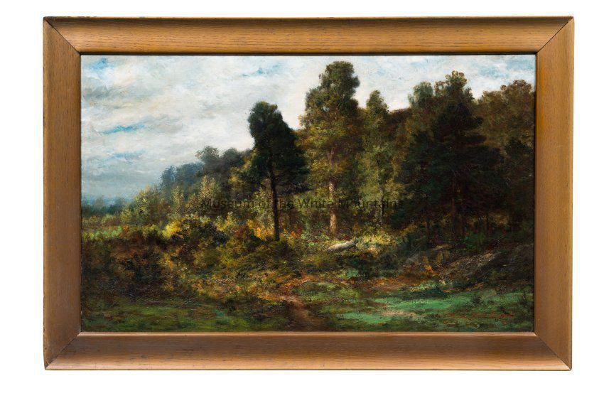 Landscape painting of the edge of woods. In the foreground is the edge of a field, but the majority of the painting is of the woods. The woods has countless trees and greenery. The largest tree is in the center, with sunlight highlighting the leaves and trunk. Some of the greenery is yellow and red.Artwork Details
