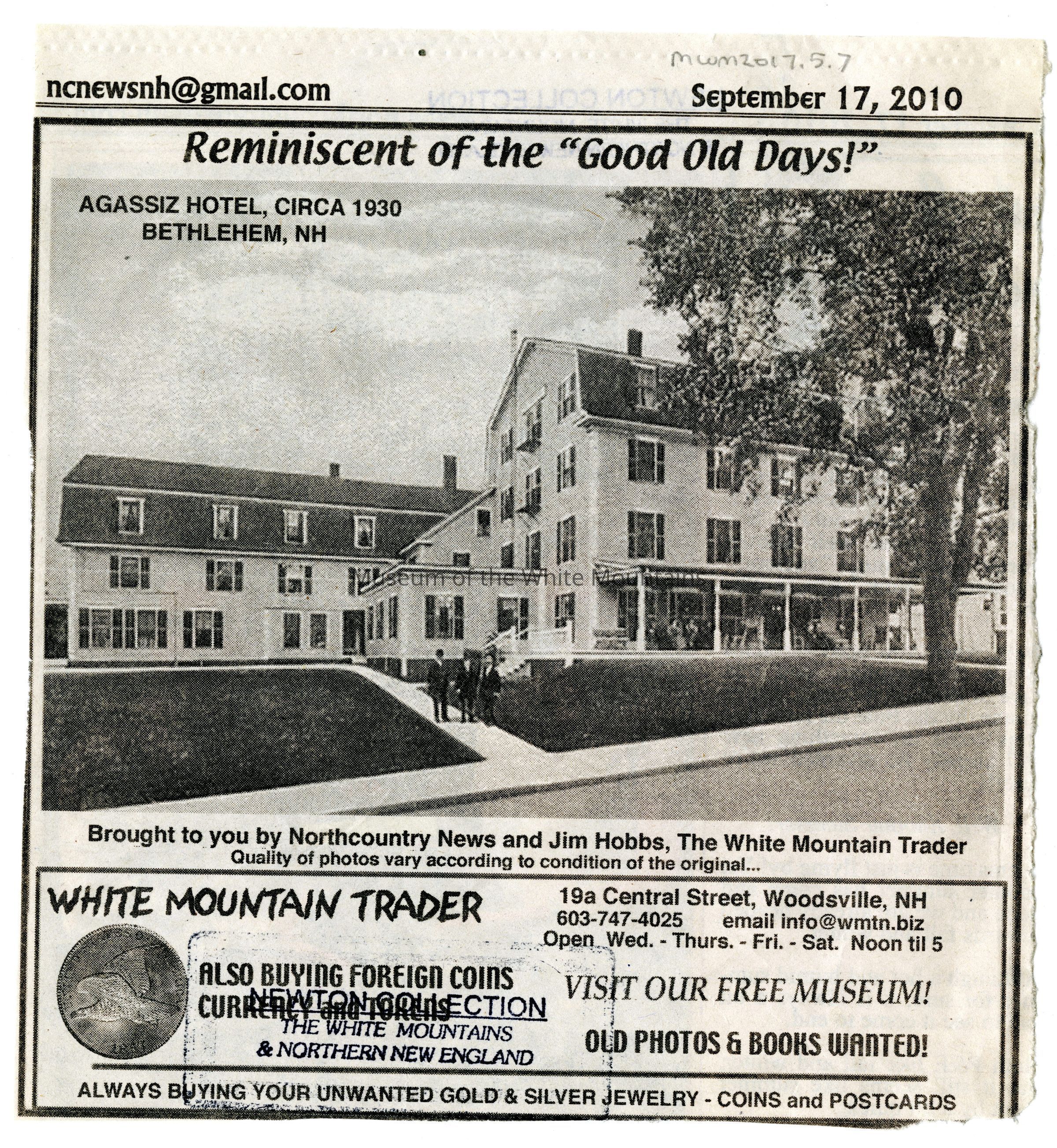 Newspaper clipping, photograph of the exterior of the Agassiz hotel located in Bethlehem, NH, circa 1930. Published in the North Country News newspaper, September 17, 2010.Collection