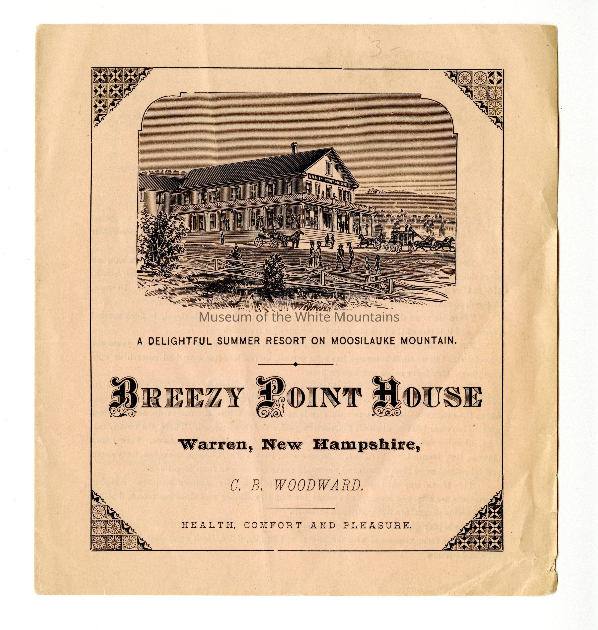 Printed pamphlet advertising Breezy Point House, a summer resort on Moosilauke Mountain in Warren, NH. Listed in the brochure are resort amenities including, views, trout fishing, ample play grounds and croquet lawns for, and a farm connected to the house, which supplies vegetables, butter, milk, and berries daily. Also listed are the distances to local attractions and weekly and daily rates. C.B. Woodward, Proprietor.Collection