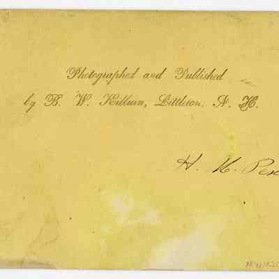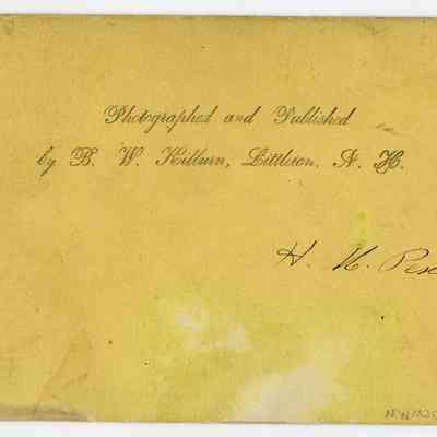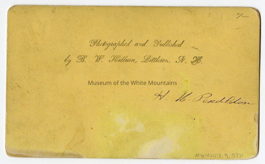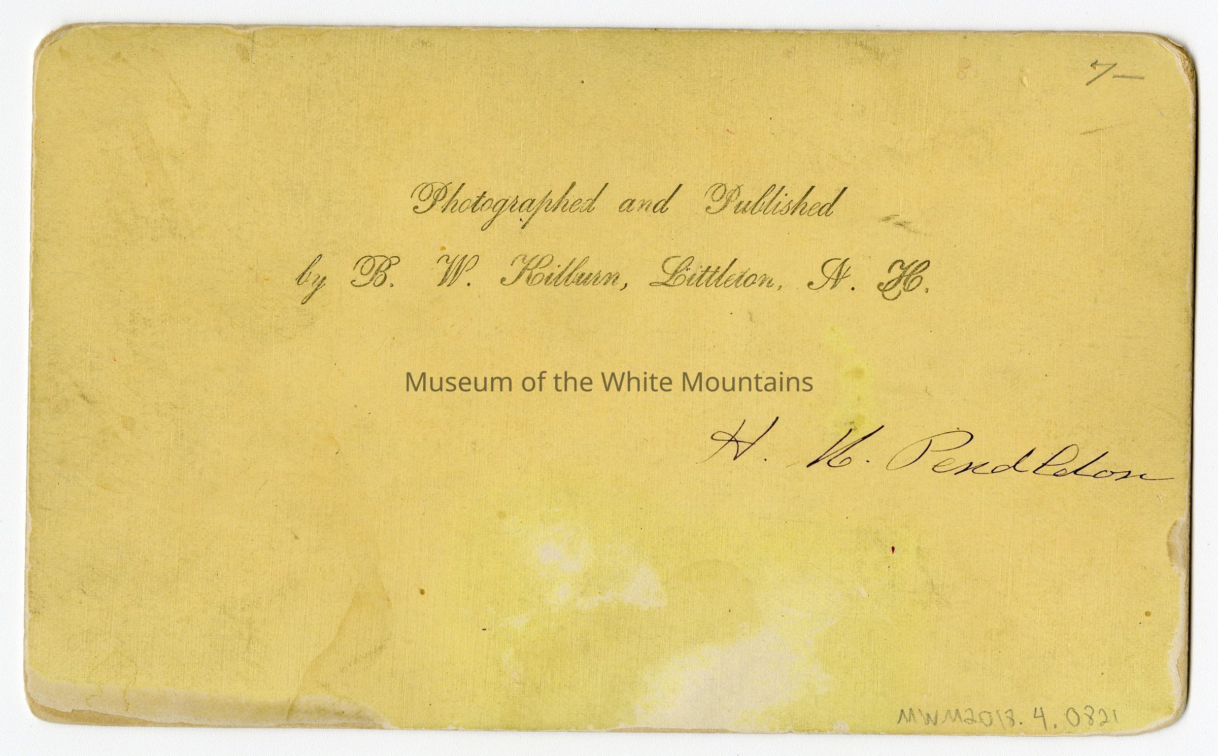 View of Dix House in Dixville Notch, New Hampshire. There is a mountain in the background with buildings including a barn and trees around the buildings. A field is in the foreground. On the back written in pen it says, "H.M. Pendldon [Question on Last name due to legibility]."