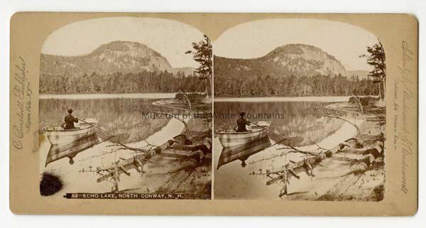 Echo Lake in North Conway there is a mountain in the background and the lake in the foreground. There is a person in a rowboat to one side and a beach with as downed tree on the other side. At the base of the mountain is a forest of trees.