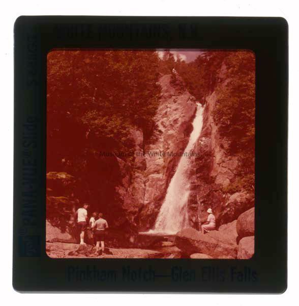 Pana-vue slide with a view of Pinkham Notch-Glen Ellis Falls includes the waterfall, and trees in the hillside with peopl in the foreground.