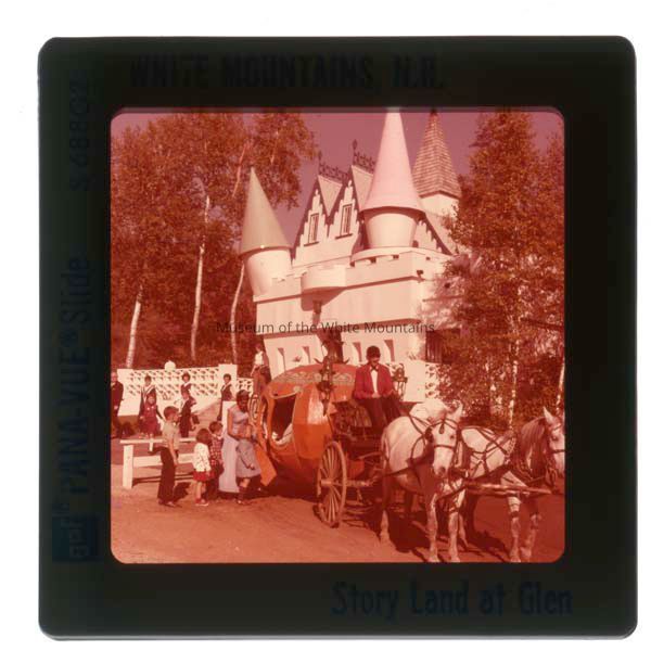 Pana-vue slide with a view of the castle at Story Land and a pumpkin coach being towed by horses in the foreground. There are trees flanking the castle and people getting in/out of the coach while a driver waits.