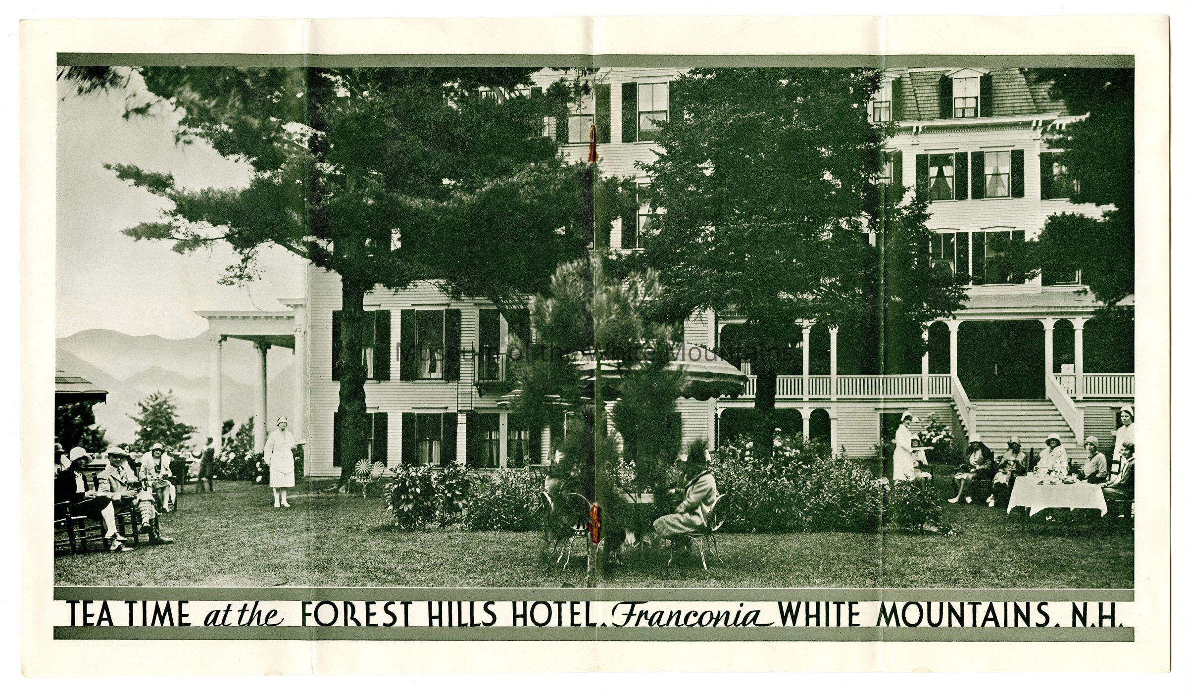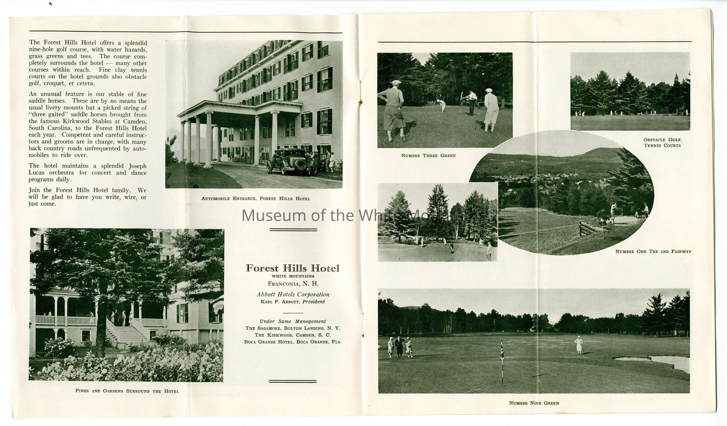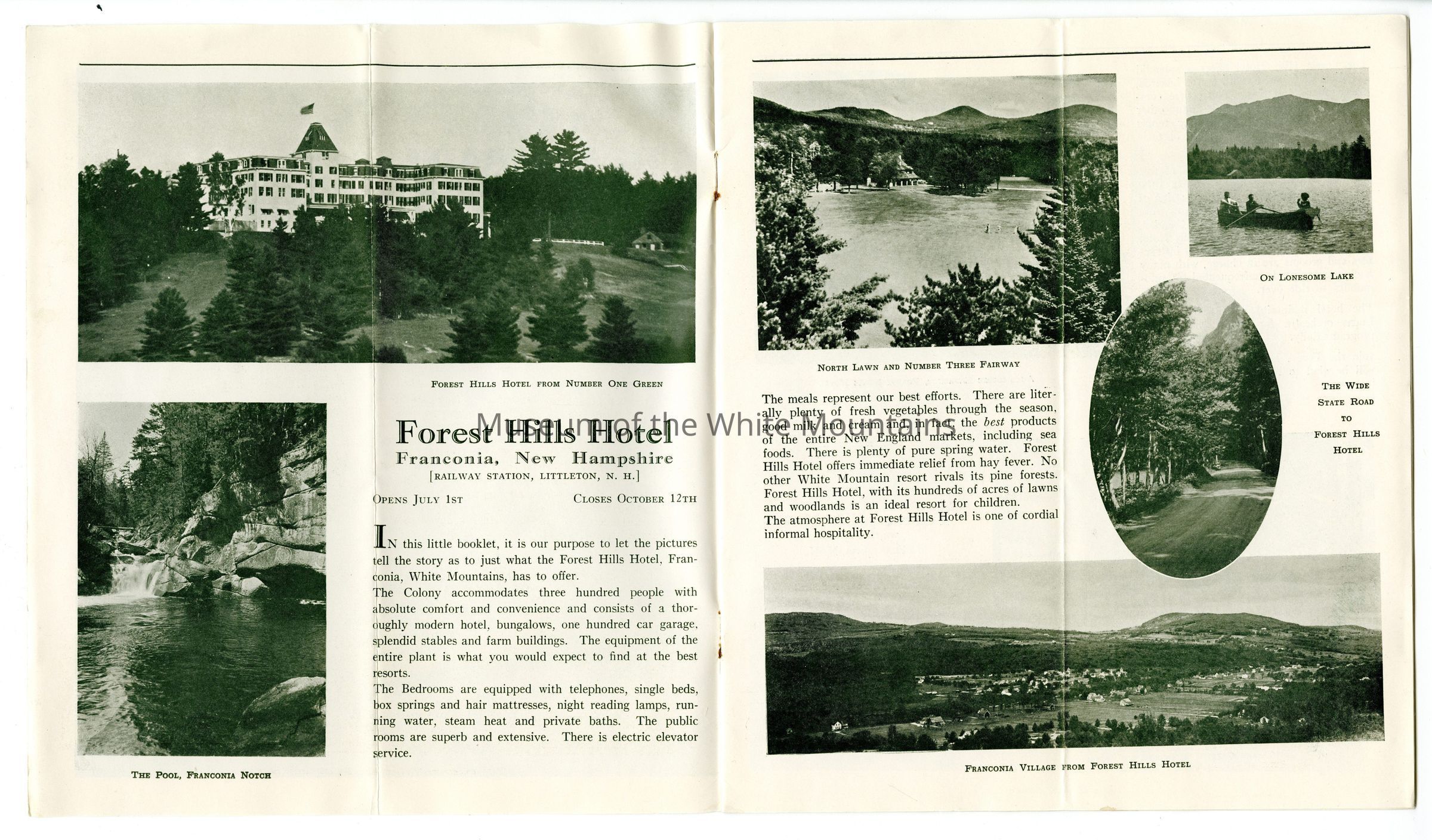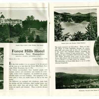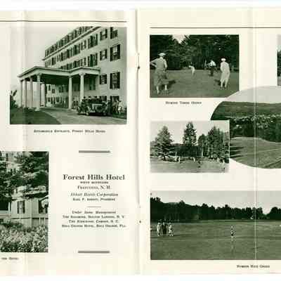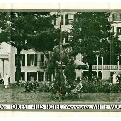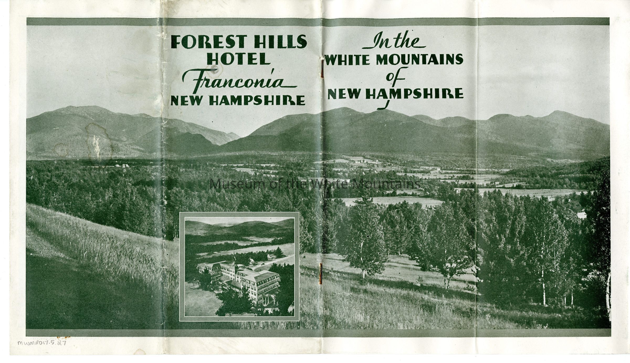 Pamphlet advertising the Forest Hills Hotel in Franconia, NH. The hotel was built in 1883 and razed in 1984. The pamphlet includes a description of the hotel, year round amenities such as golf, riding, local attractions, travel information, and several photographs of the hotel, cottages, and the area.Collection