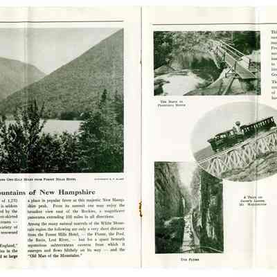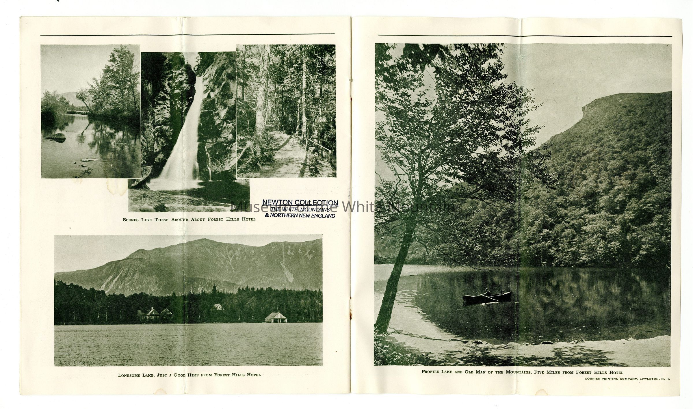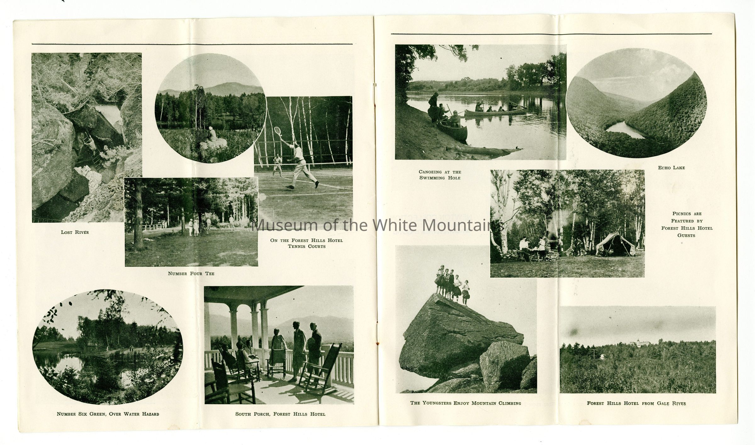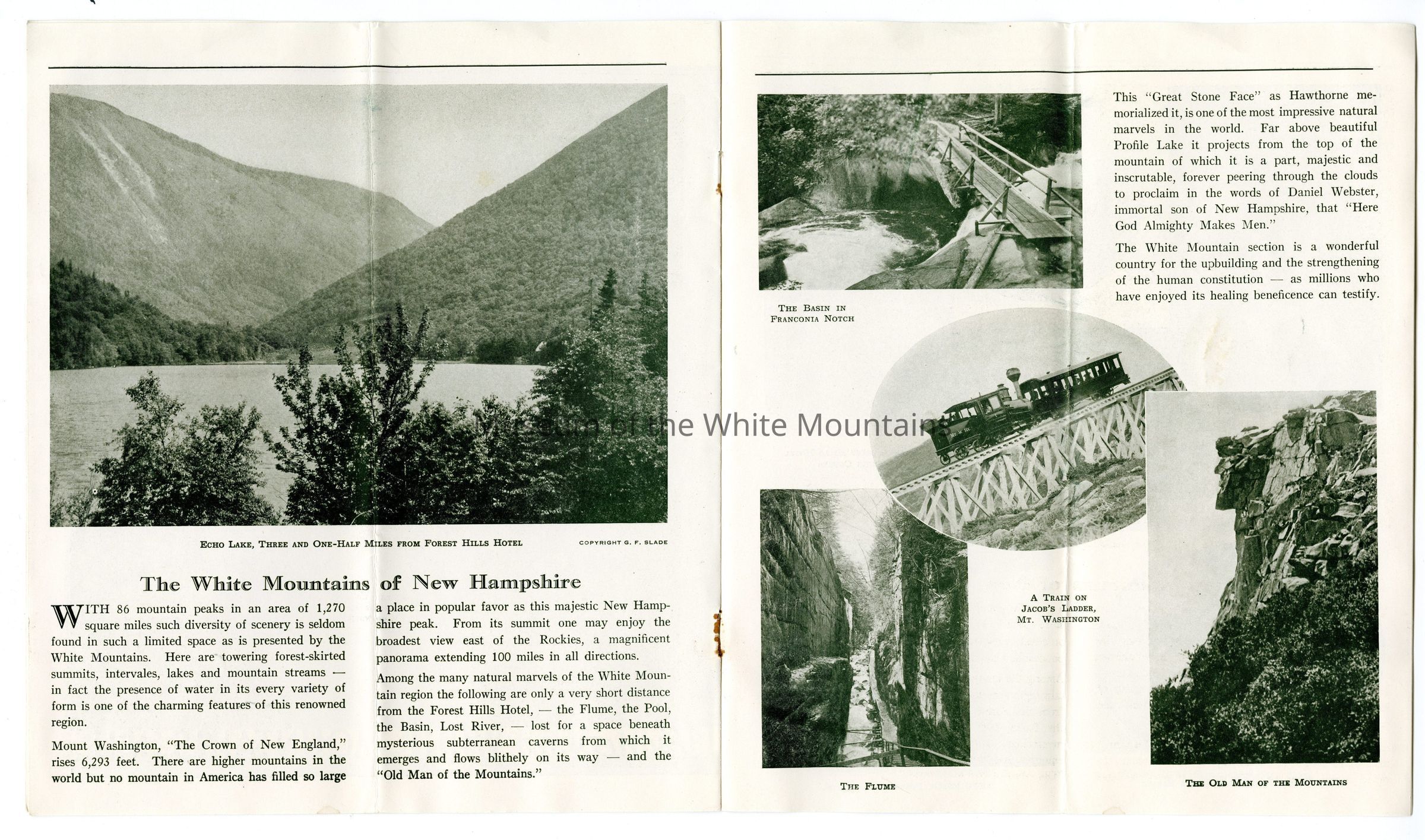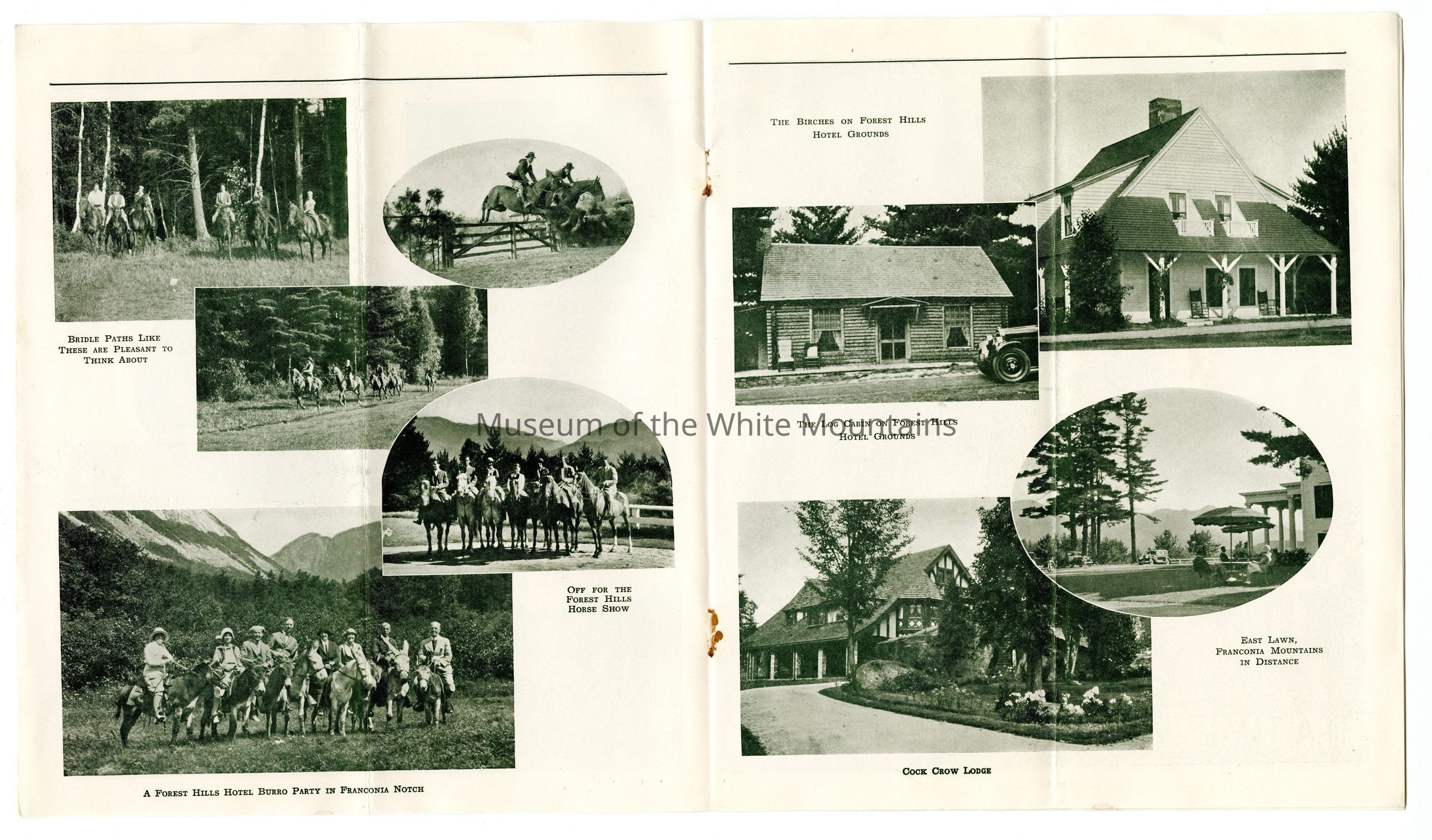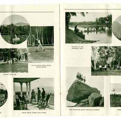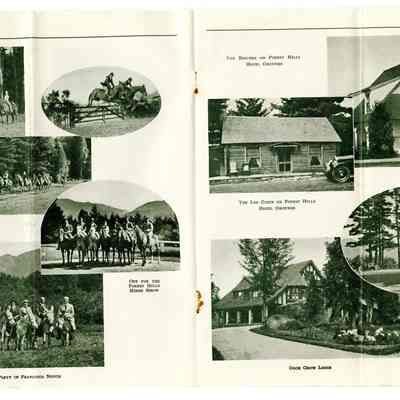Pamphlet advertising the Forest Hills Hotel in Franconia, NH. The hotel was built in 1883 and razed in 1984. The pamphlet includes a description of the hotel, year round amenities such as golf, riding, local attractions, travel information, and several photographs of the hotel, cottages, and the area.Collection