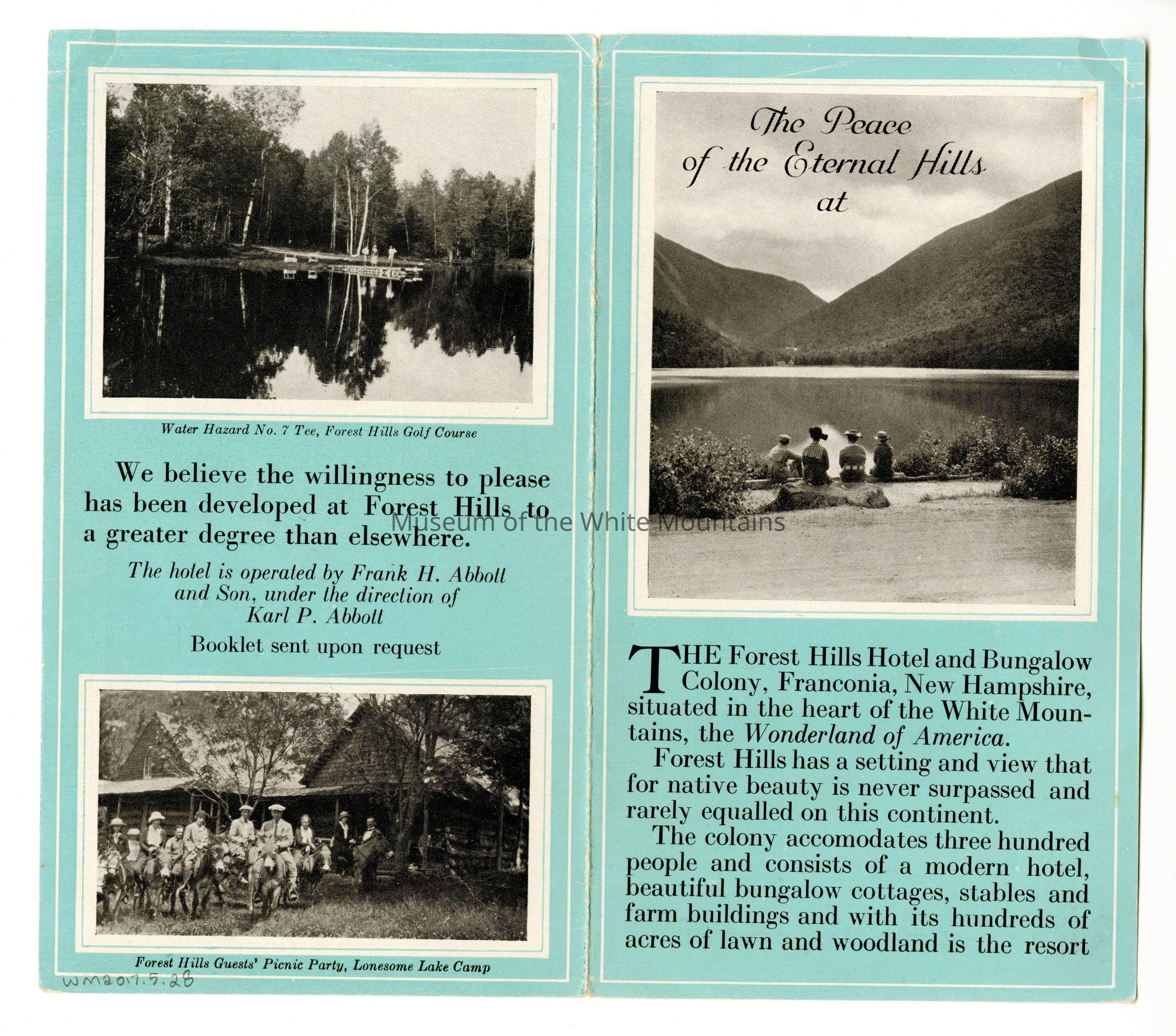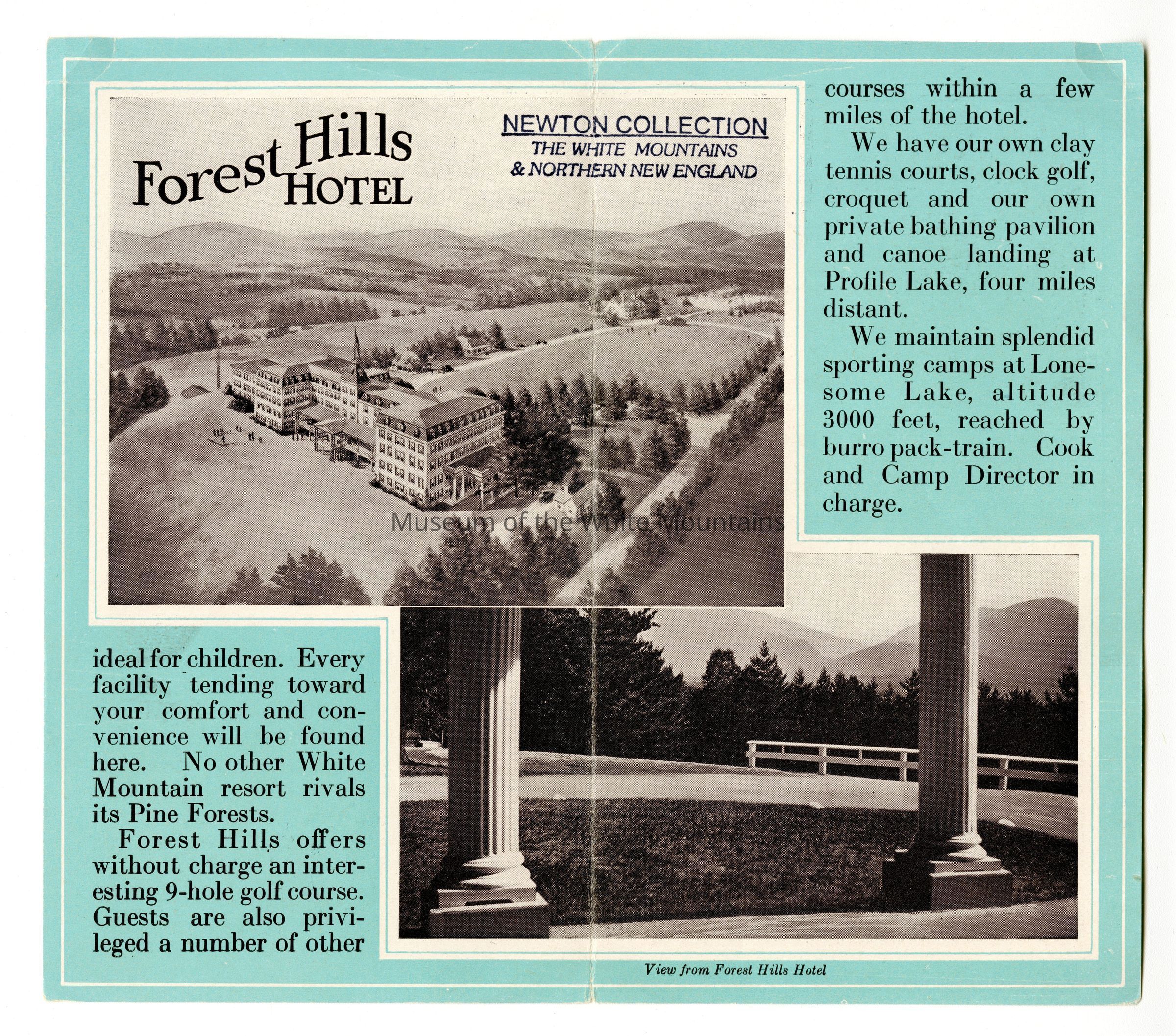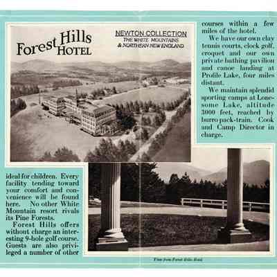 Pamphlet advertising the Forest Hills Hotel and Bungalow Colony in Franconia, NH. The pamphlet includes a description of year round amenities, and several photographs of the exterior of the hotel and the area. Frank H. Abbott and Son, Proprietor.Collection
