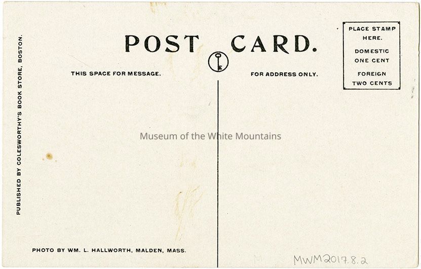 Colorized postcard of a white Church next to a white school, with a mountain in the background, located in North Woodstock, NH. Published by Colesworhy's Bookstore, BostonCollection