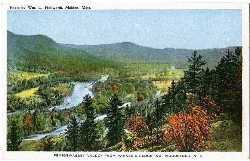 A colorized postcard depicting a view of the Pemigewasset Valley from Parker's Ledge, with a stream and trees in the foreground, and mountains in the background.