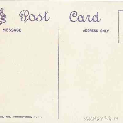 A colorized postcard depicting Profile Lake framed by trees in the foreground, and Eagle Cliff in the background.