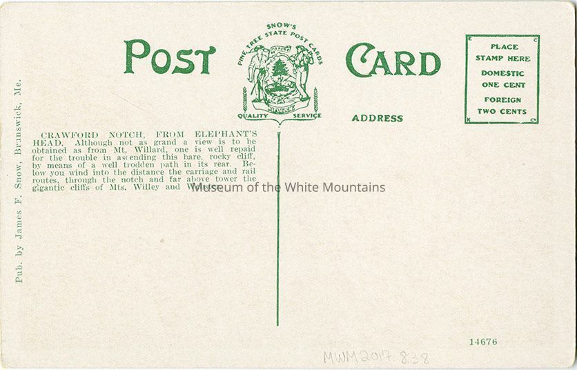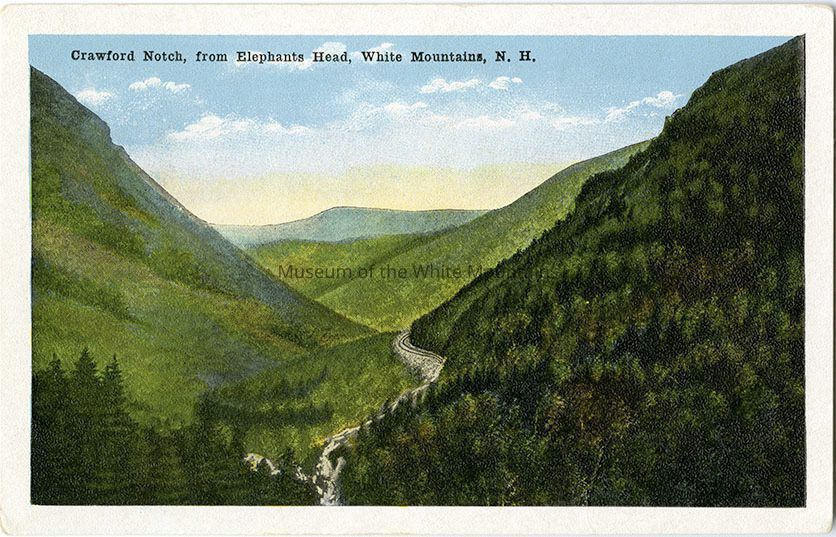 "CRAWFORD NOTCH, FROM ELEPHANT'S HEAD. Although not as grand a view is to be obtained as from Mt. Willard, one is well repaid for the trouble in ascending this bare, rocky cliff, by means of a well trodden path in its rear. Below you wind into the distance the carriage and rail routes, through the notch and far above tower the gigantic cliffs of Mts. Willey and Webster".Collection
