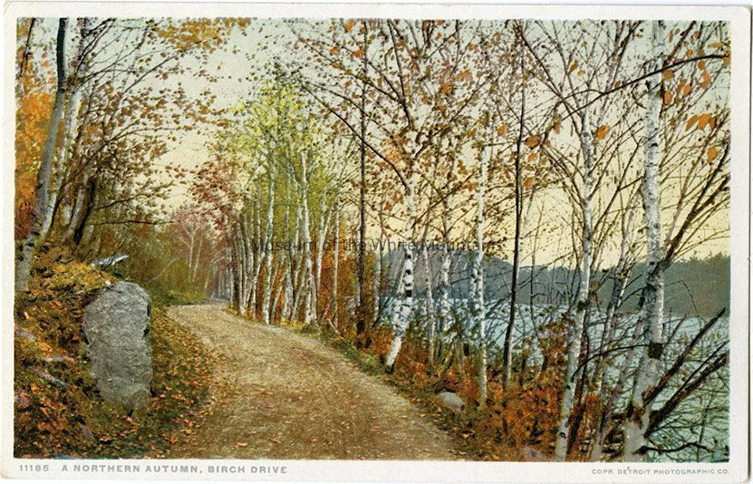 A colorized postcard depicting White Birch trees turning orange in autumn, a road cutting through, and a pond seen through gaps in the trees.
