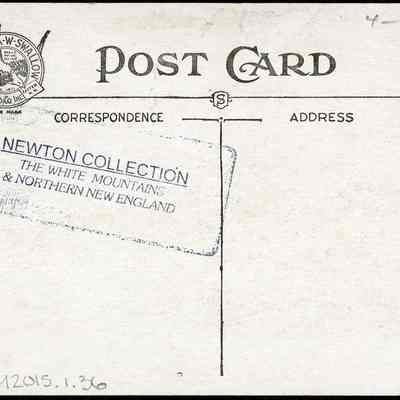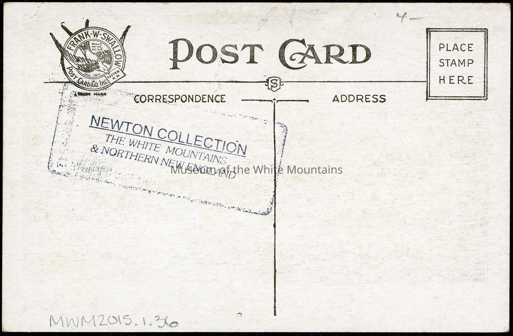 A black and white photo shows the exterior of the Pemigewasset House in Plymouth, N.H. Some parts of the image have been colored in green, such as the trees, field, and house. Published by Frank W Swallow Post Card Co. Inc., Exeter, N.H.Acquisition