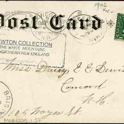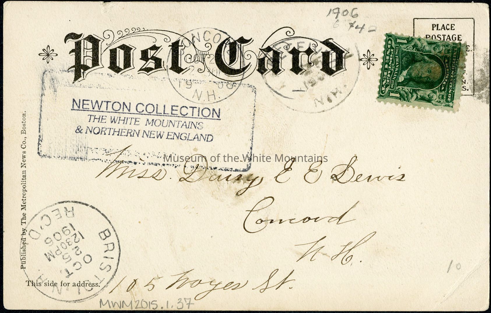 Back Description: On the back is an address to Miss Daisy E E Davis(?) at 105 Hayes St., Concord. Also written is a date, Oct. 25, 1906, and in cursive, is H or K, L C. as well as a Benjamin Franklin $1 stamp.
