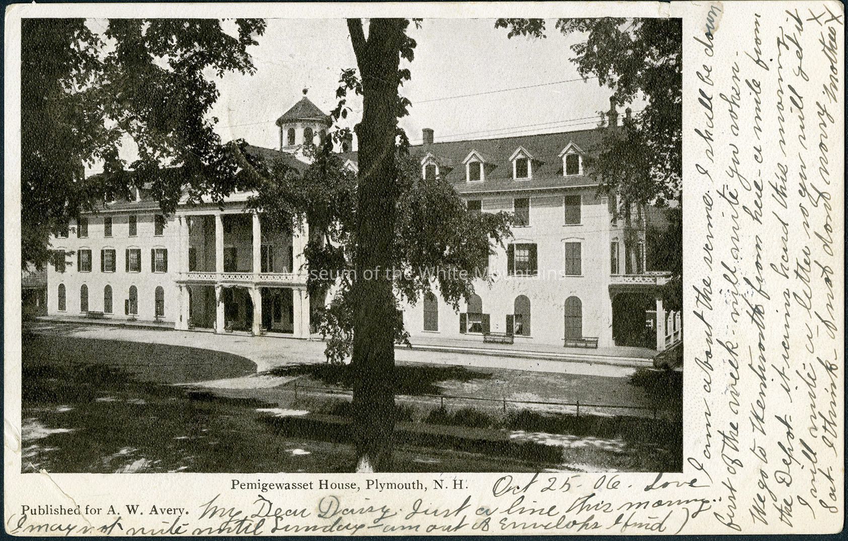 A black and white photo shows what appears to be the front exterior of the Pemigewasset House in Plymouth, N.H. There is writing on the front from a mother to her daughter, Daisy. On the back is an address. Published by The Metropolitan News Co., Boston.
