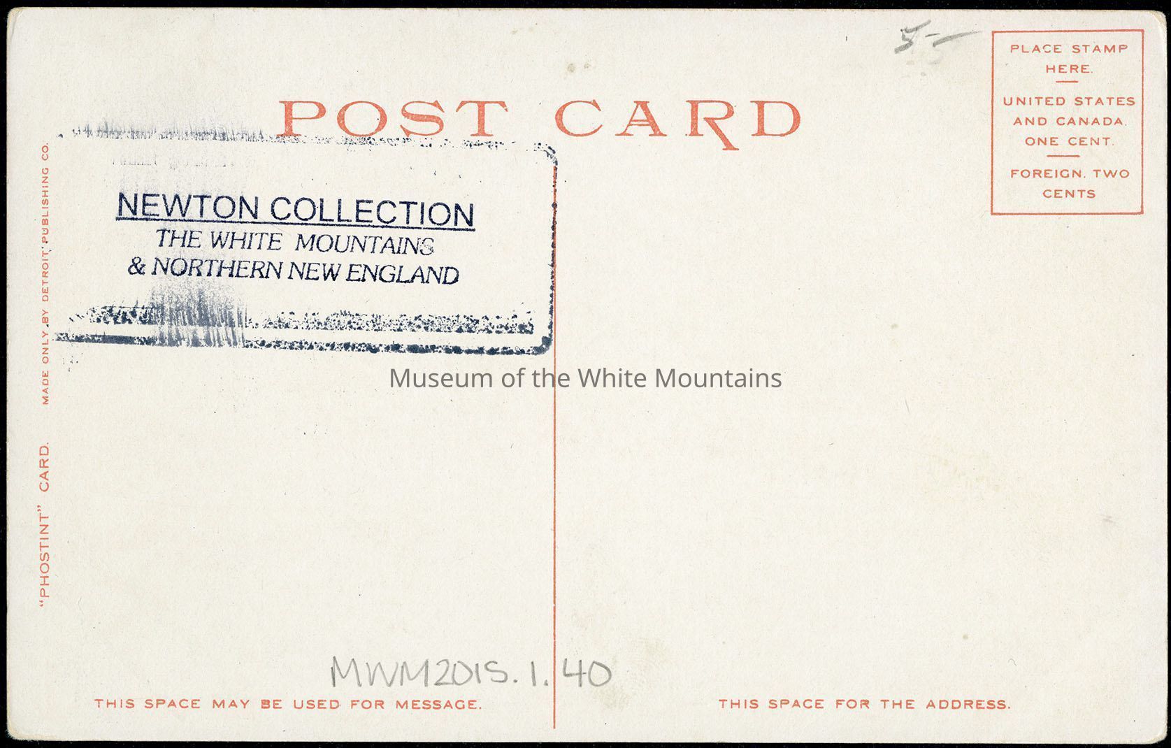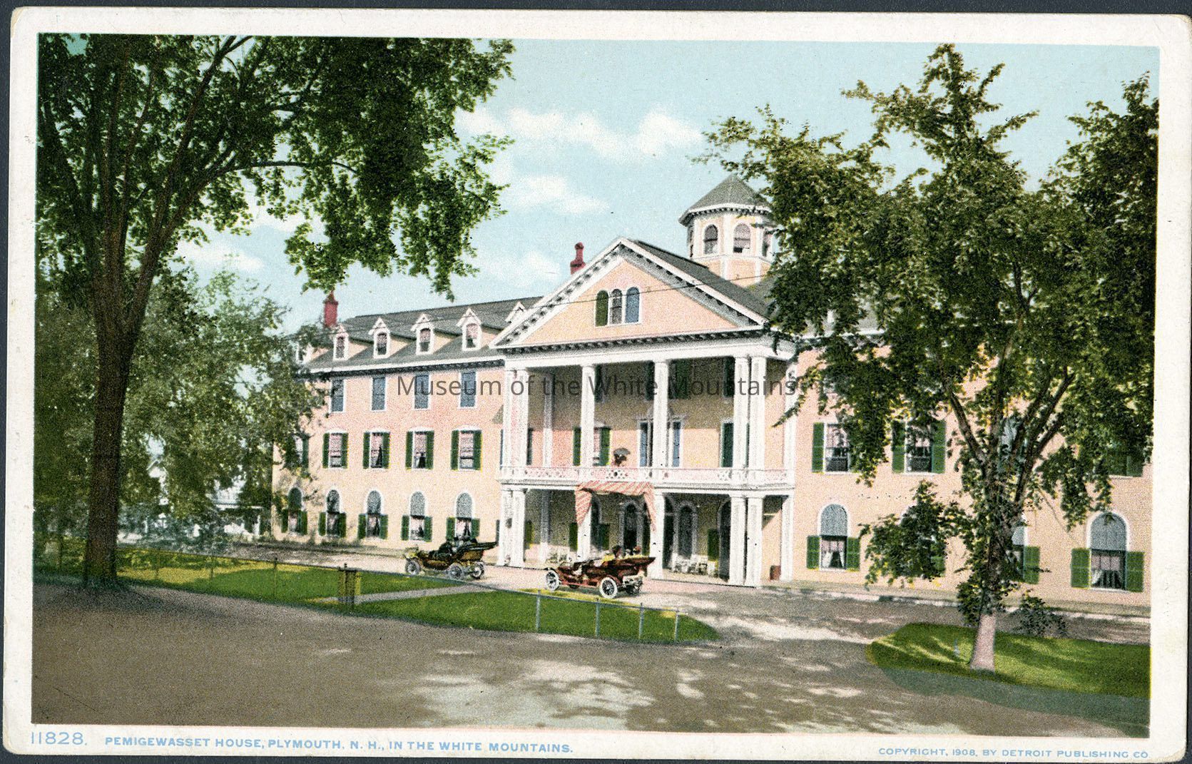 A color photograph of the Pemigewasset House in Plymouth, N.H. depicts two automobiles lined in front what seems to be the front entrance of the hotel. Trees are situated in front. Published by Detroit Publishing Co.Acquisition