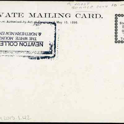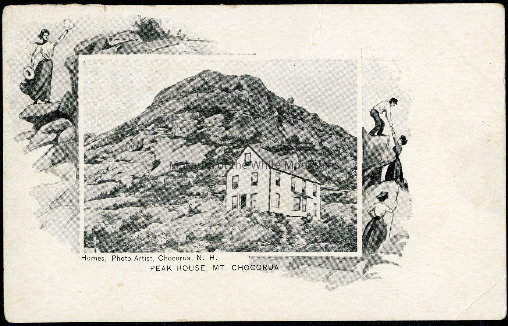 A black and white photograph depicts the rocky peak of Mt. Chocorua and the Peak House sitting just below.