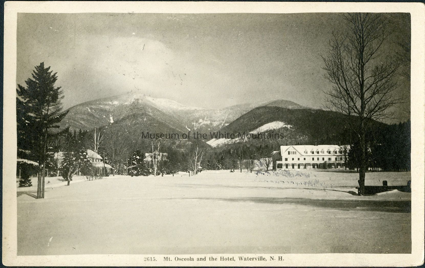 A black and white photograph shows Mount Osceola covered in snow, with several buildings and a hotel in the midground. A blanket of snow covers the ground.