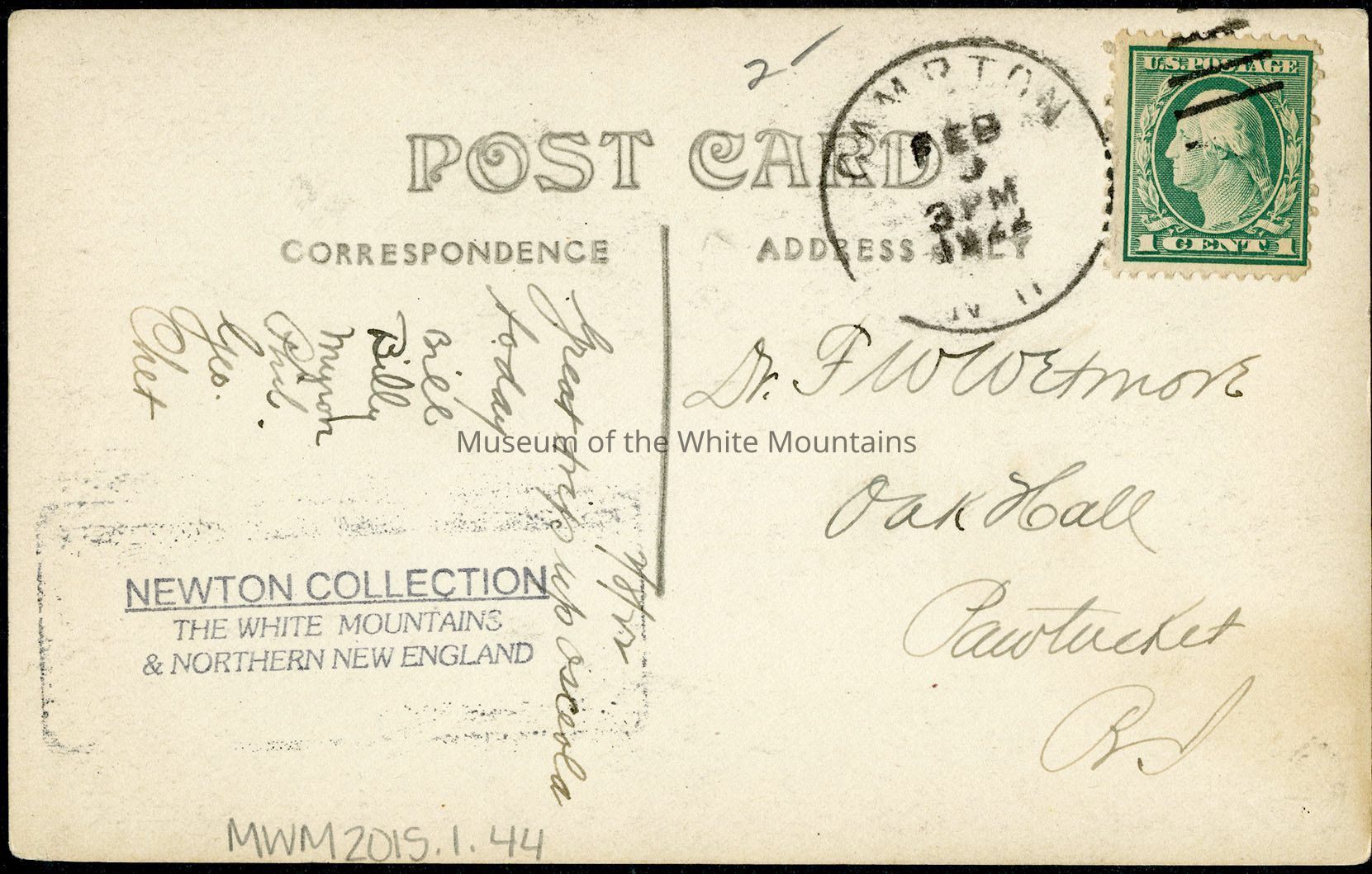 Back Description: A short message is written on the back addressed to Dr. F W Wetmore and a stamp is in the right upper corner with a date.