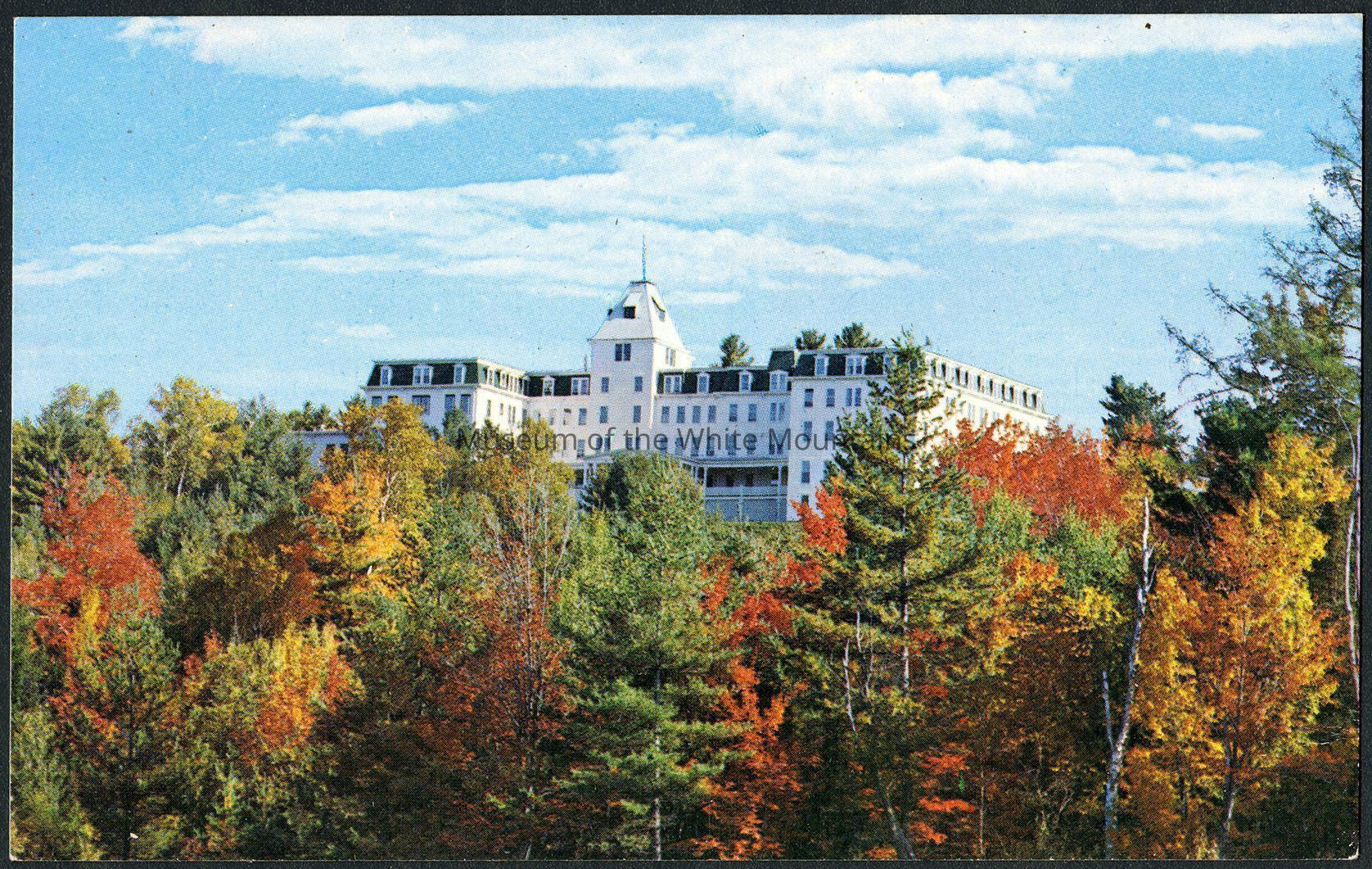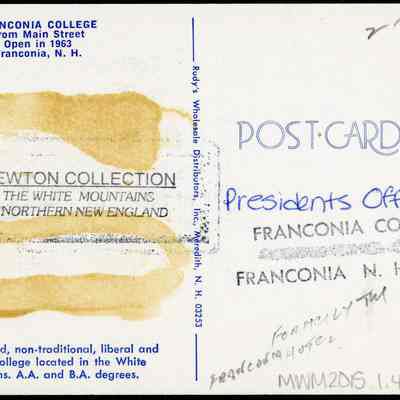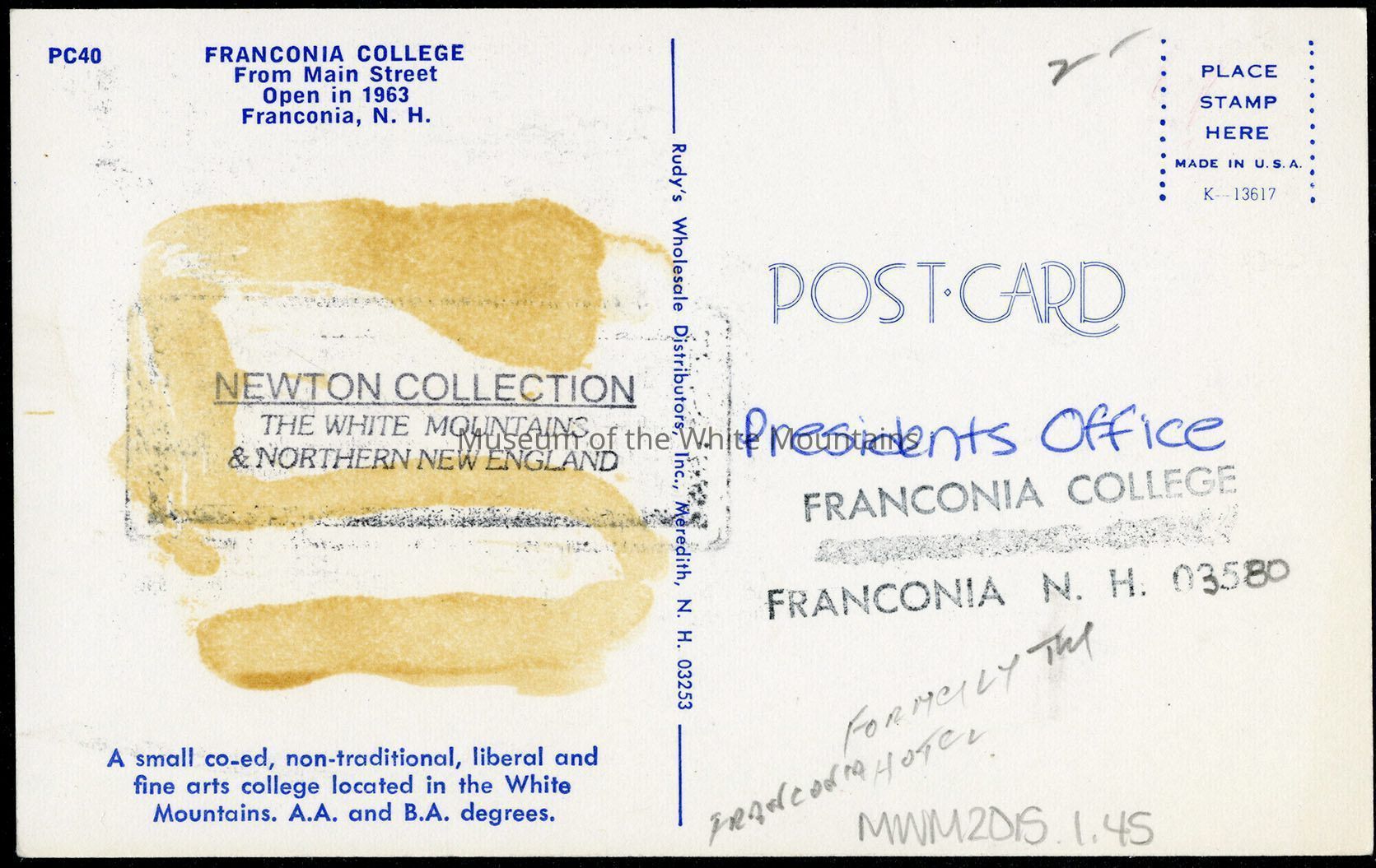 A color photo of the Franconia College depicts fall foliage surrounding the white building with clouds in the sky. Published by Rudy's Wholesale Distributers, Inc., Meredith, N.H.