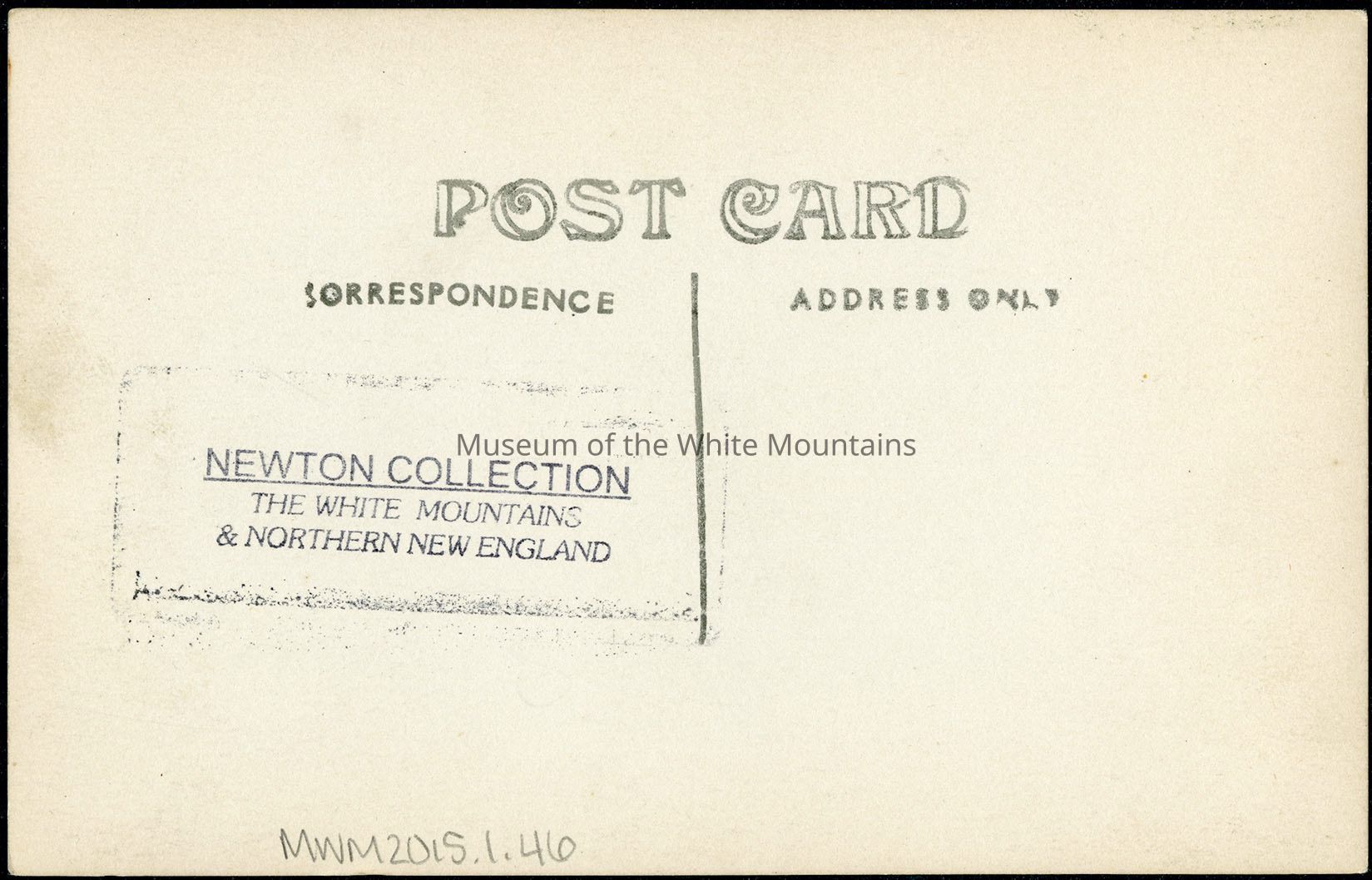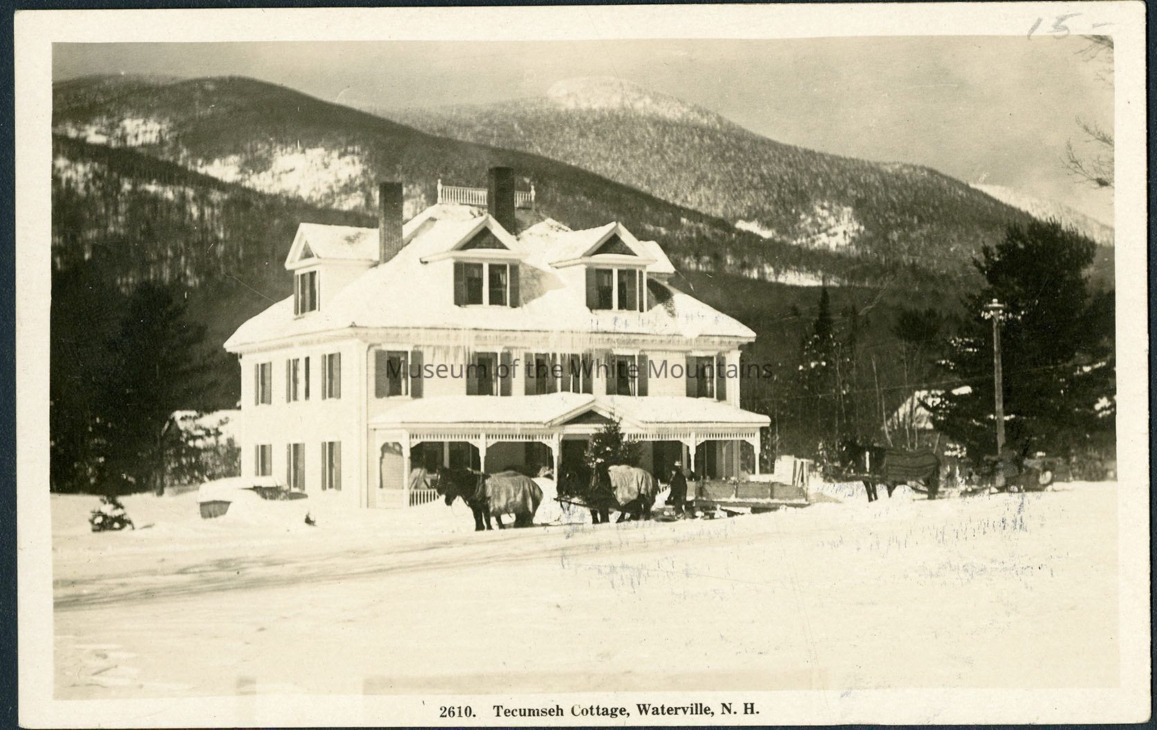 A black and white image of Tecumseh Cottage in Waterville, N.H. shows horse-driven carts on a snow-covered road just in front of the cottage with the mountains in the background.Acquisition