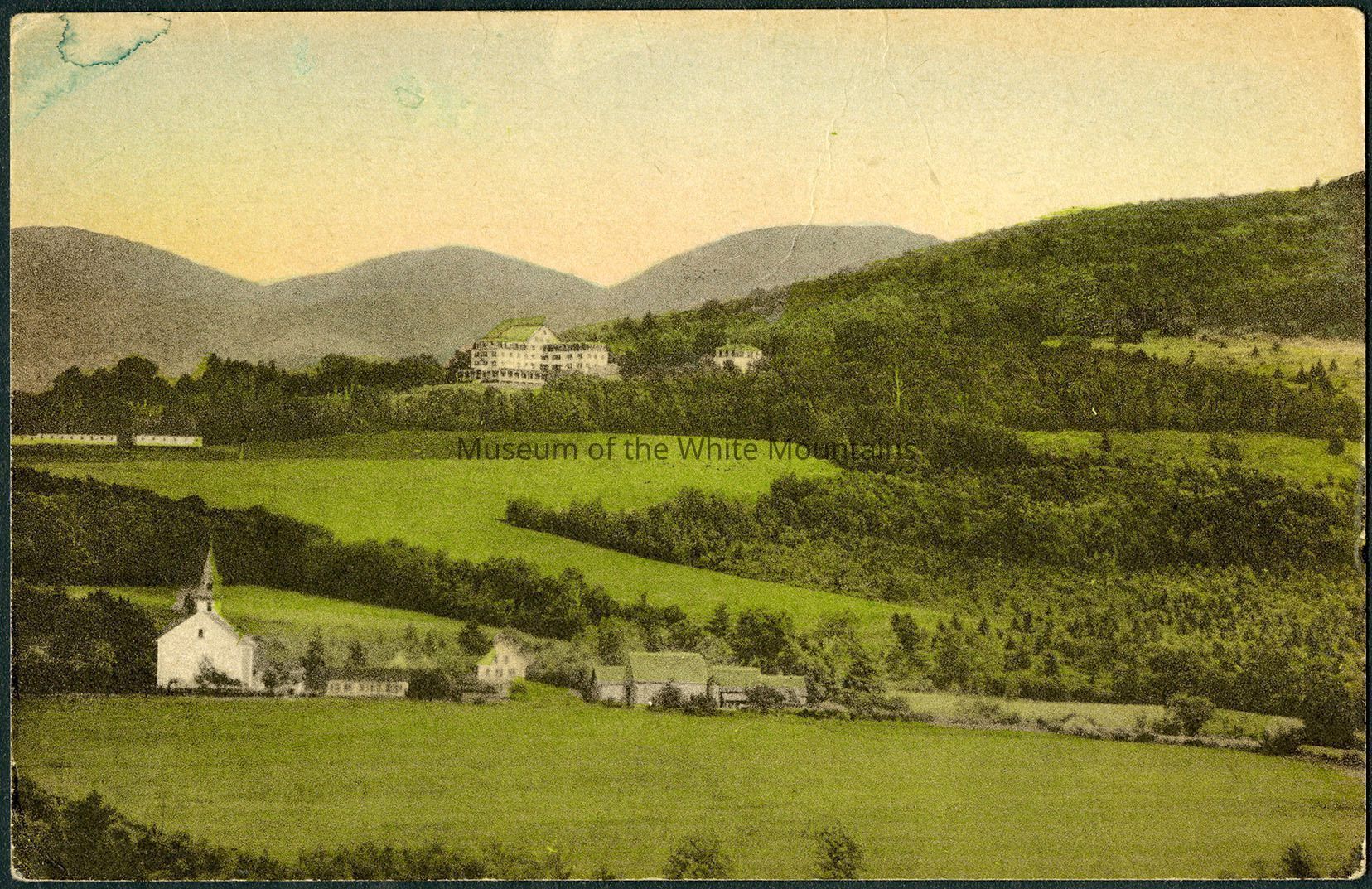 The view from a hotel lookout is shown in color and depicts rolling green hills with trees, houses and a church. In the distance is a large white building, possibly a hotel, and mountains.Acquisition