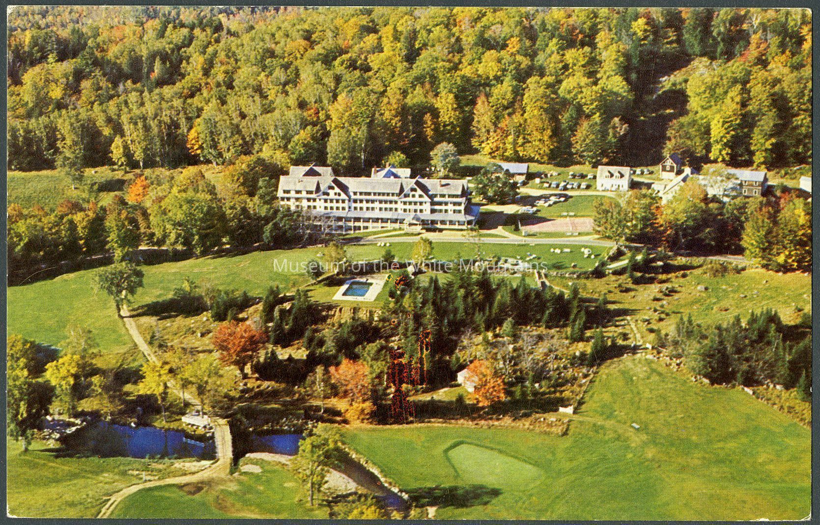 A color image of the Eagle Mountain House is shown with green fields and trees surrounding the house. What appears to be a river sits in the foreground, next to what looks to be a golf course, a pool and tennis court. Published by Mike Roberts.