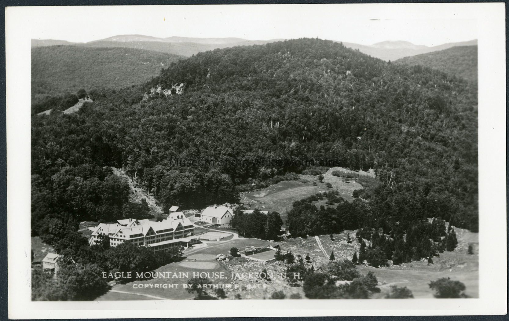 A black and white image of the Eagle Mountain House in Jackson, N.H. shows an aerial view of the house with mountains in the background. On two sides of the hotel are fields and more trees. Published by The Shorey Studio, Gorham, N.H.Acquisition