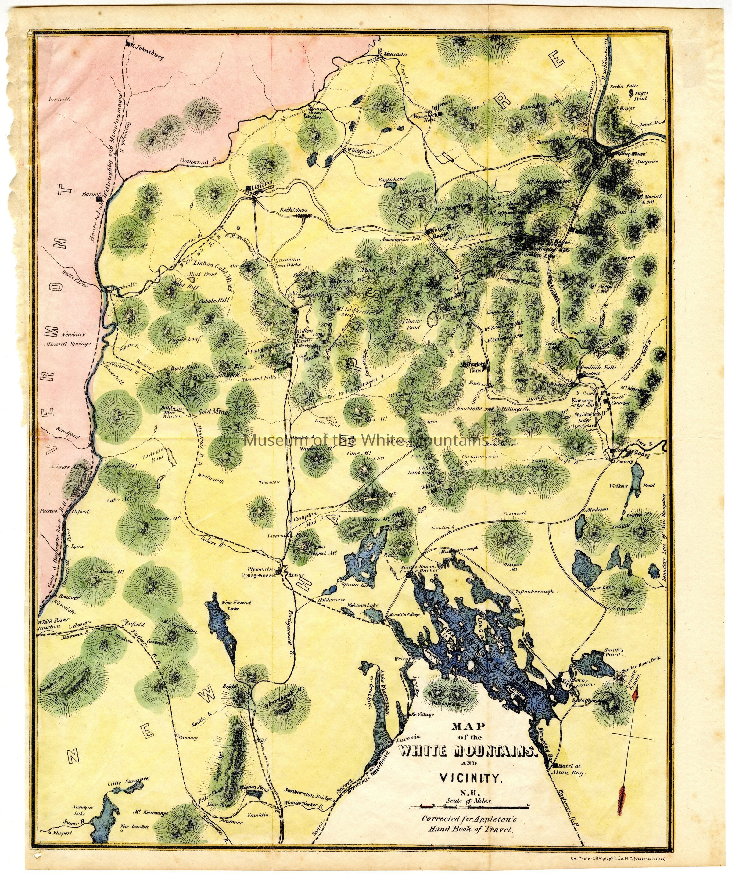 A map showcasing the White Mountains region of New Hampshire from Andover and Franklin in the south, including the Lakes Region, up to Lancaster in the north; and west from the Vermont border and a small section of Vermont (un-detailed) to the east boundary line of New Hampshire.Acquisition