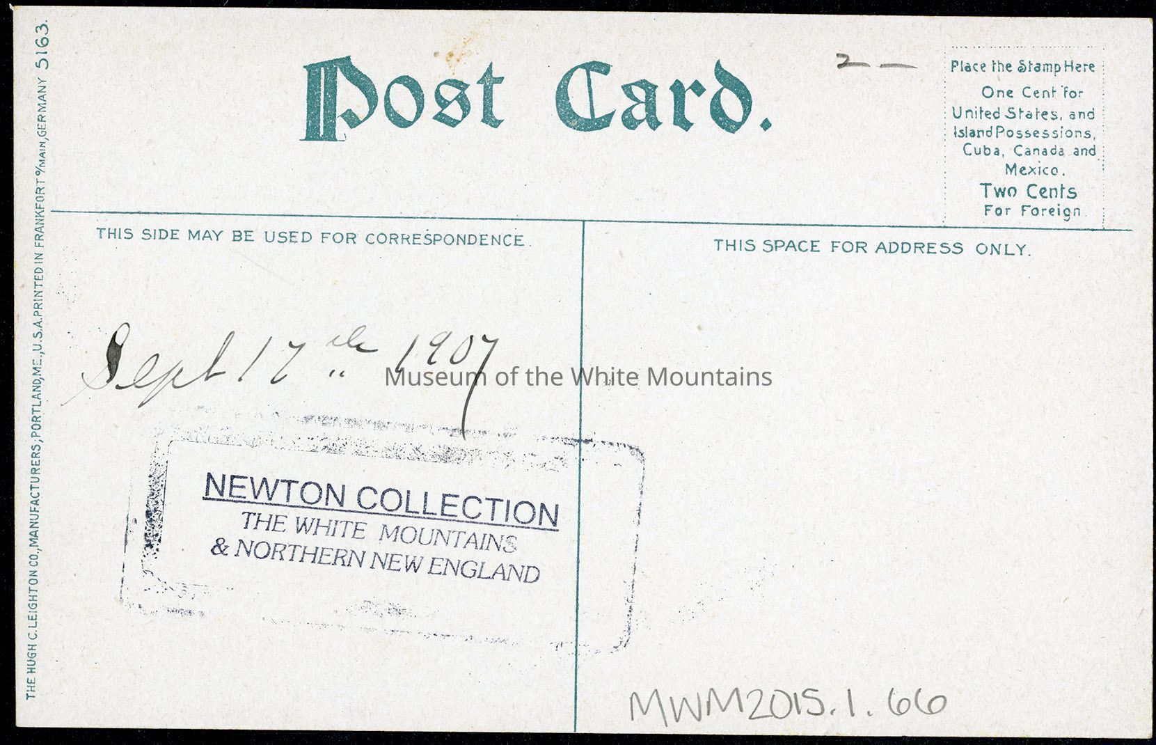 A color image shows a pond, field, a couple of houses and what looks to be a project in the works or rubble. Mountains are visible in the distance and trees line the edge of the pond and field. Published by the Hugh C. Leighton Co.