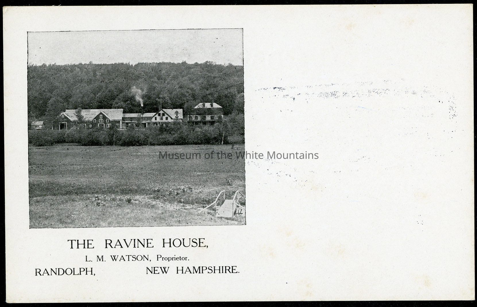 A black and white photograph shows the Ravine House set back near a thick tree line and a field in front. A bridge sits in the bottom right hand corner, built over what looks to be a small stream. Named for King's Ravine, which could be seen from the house, the inn closed in 1960.Acquisition