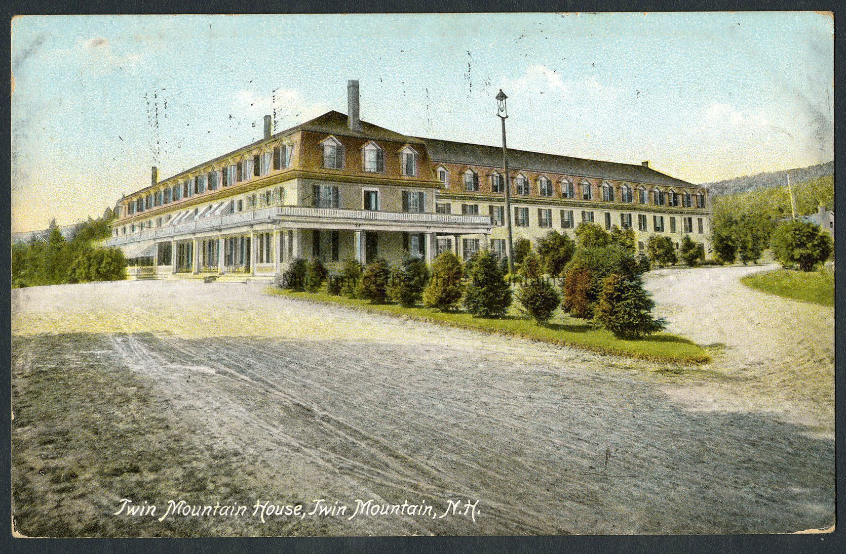The Twin Mountain House dominates the image, with its four stories, second story deck and first floor porch. Scattered trees sit in the foreground with a driveway on either side. Published by the Atkinson News Co.