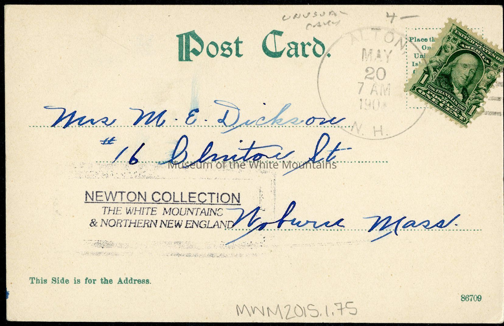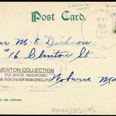 Back Description: An address and date are on the back. The date is May 20, but the year is indistinguishable. On the front is a short note.