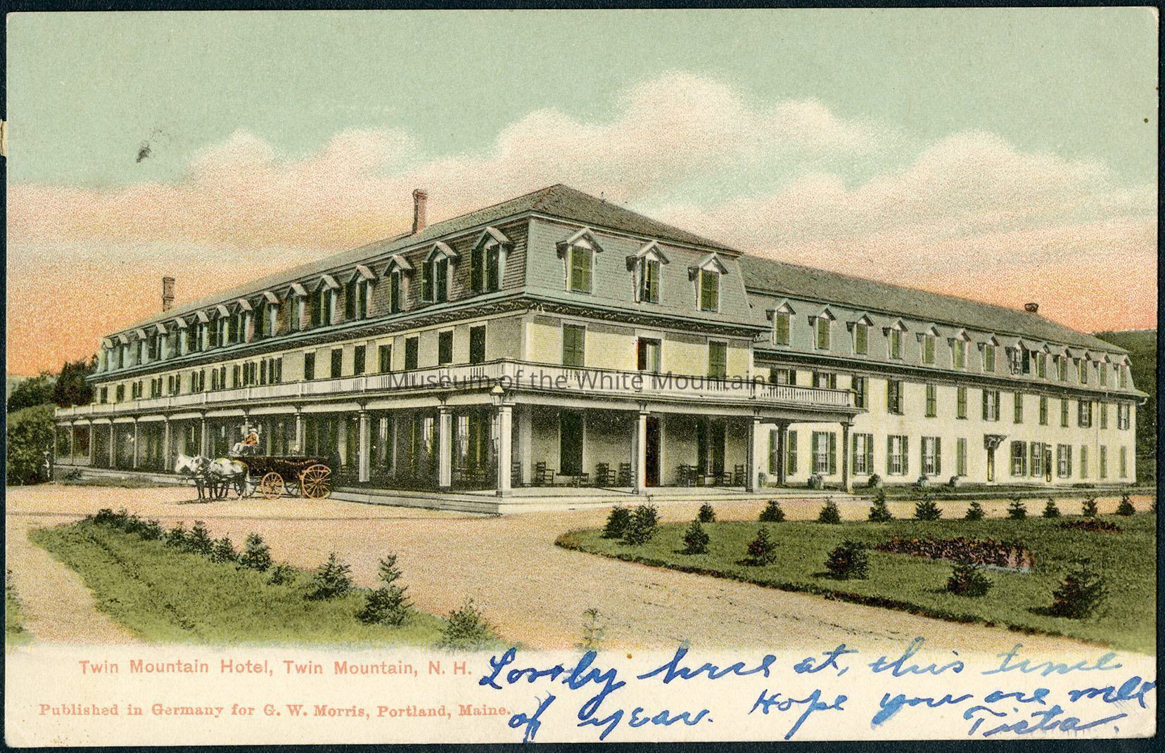 The Twin Mountain hotel is pictured in this colored image with a wrap-around porch and a deck on the second floor. Out front, is a horse and carriage and small trees sit in the lawn.
